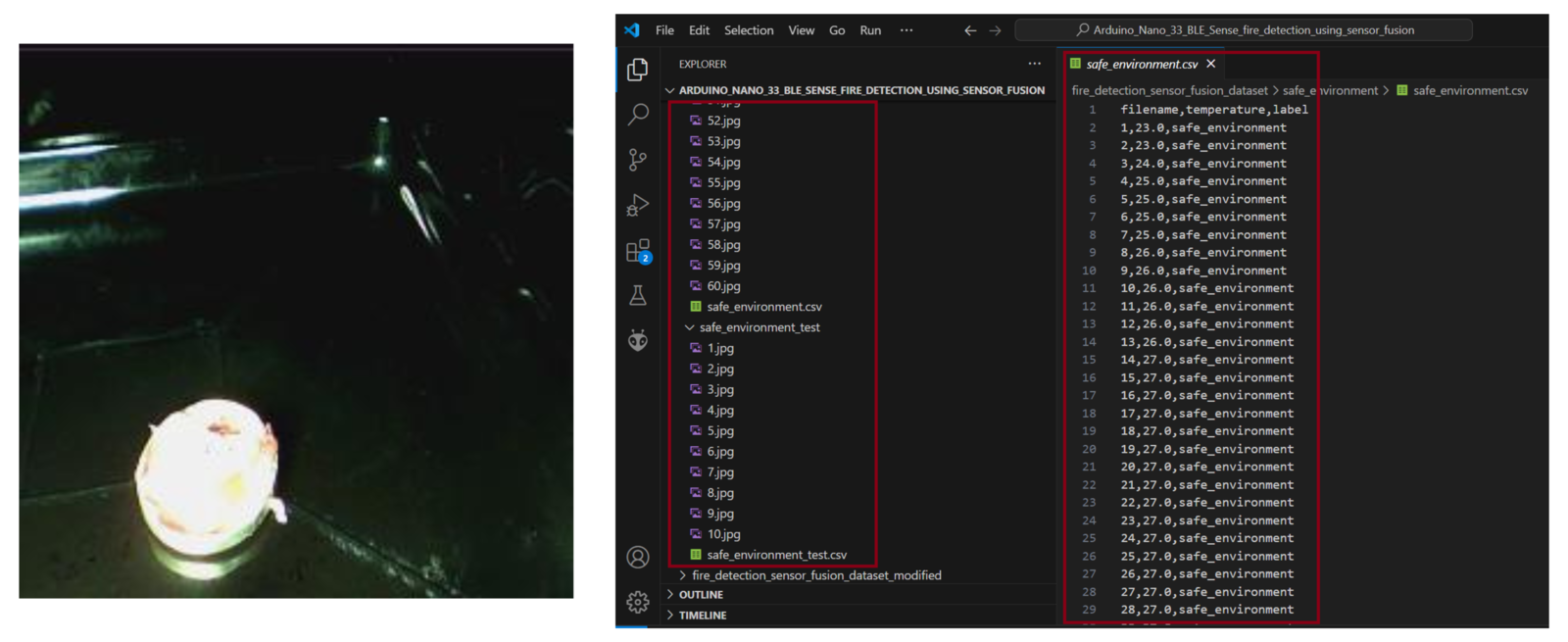 Since fire is dangerous and difficult to control, I used an oven and a candle to collect data. The oven generates temperatures higher than the ambient room temperatures and this can be detected by a temperature sensor. The candles gives a flame which can be optically detected by a camera. Therefore, both sensors compliment each other. I secured the Arduino TinyML kit on a tripod stand and faced it to an oven. For the safe environment (safe_environment class), I had the oven switched off and the candle was not lit. In total, I collected 60 images and 60 temperature values that were ranging between 23 and 27 degrees Celsius. The images below show photos of how the Arduino board was placed next to an oven, an image that was captured and also the .CSV file with the temperature values and the class label.
