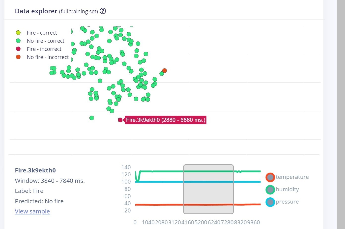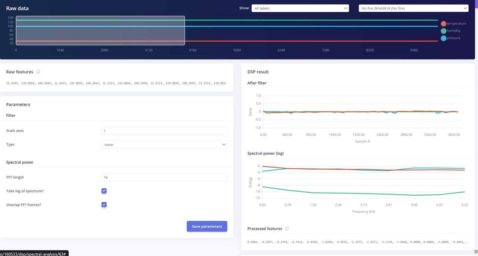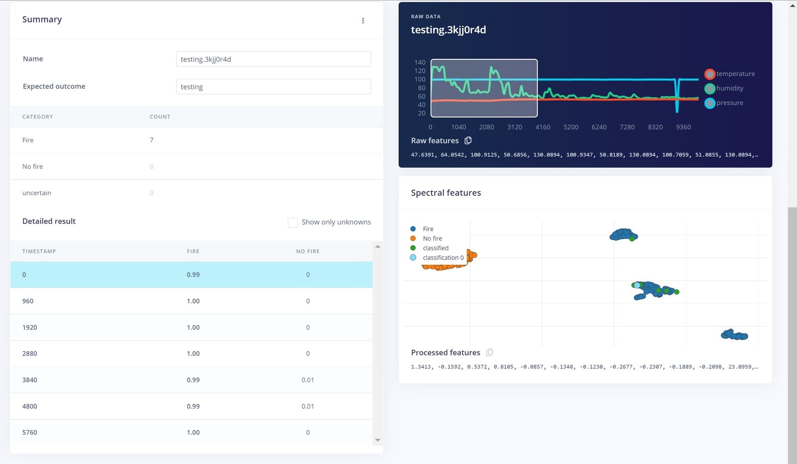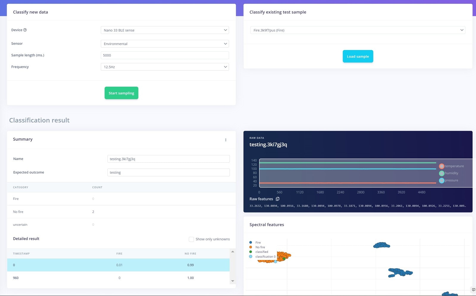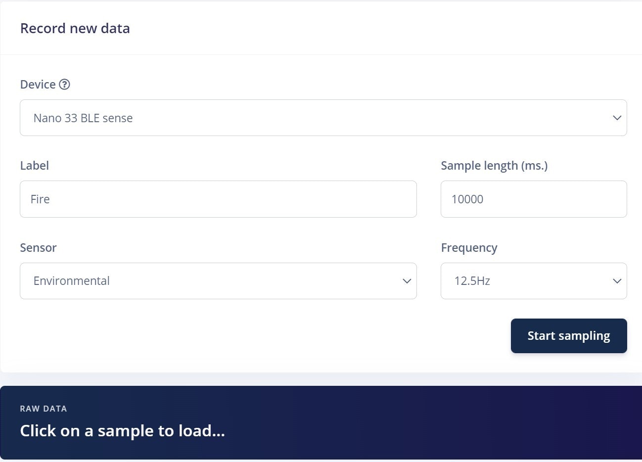 To make this project a reality, we are using an Arduino Nano 33 BLE Sense with Edge Impulse. For data collection, there are two ways to get data samples into the Edge Impulse platform: either through the Edge Impulse CLI, or through a web browser logged into the Edge Impulse Studio. To ensure your Arduino Nano 33 is properly connected to Edge Impulse, you can follow the Getting Started Guide that shows how to connect the Nano 33 and reach a point where you are ready to upload your data. Collecting data through the web browser is simple and straightforward. To do this, connect the device to your computer and open the Edge Impulse Studio. Press the Connect Using WebUSB button, and select your development board. The limitation of using the web serial integration is that it only works with development boards that have full Edge Impulse support. The data collection settings for our project are shown below. Using temperature, humidity and pressure as environmental sensors is a good choice, as they are the parameters that change the most in case of fire events. Also, the sampling rate of 12.5 Hz is appropriate as these parameters are slow-moving.