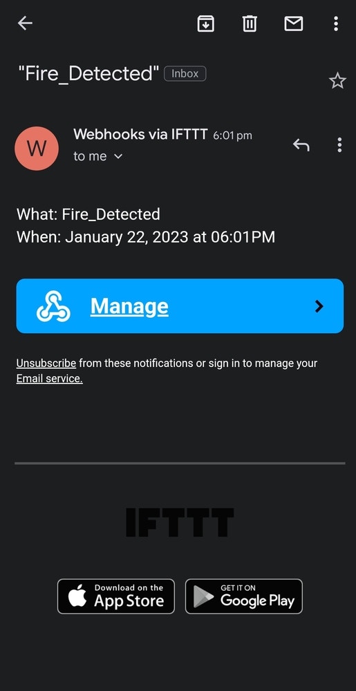 As mentioned, we built a feature that will send a notification to a user if a Fire event detection (Classification) is detected. For sending a push notification to a user, we used the IFTTT service. Please refer this tutorial to build your own version.