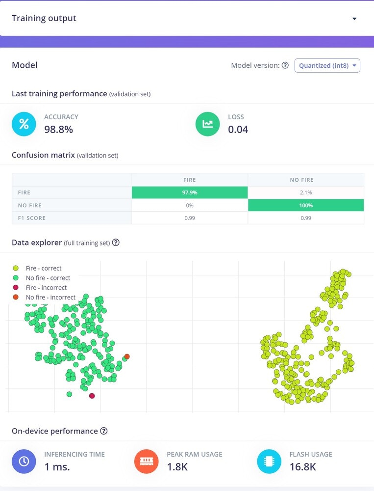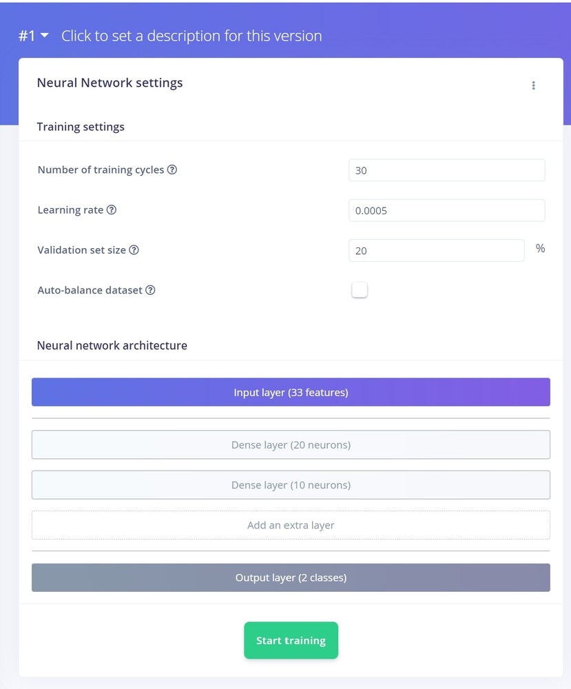 After successfully extracting the features from the DSP block, it’s time to train the machine learning model. Here are our Neural Network settings and architecture, which work very well for our data.