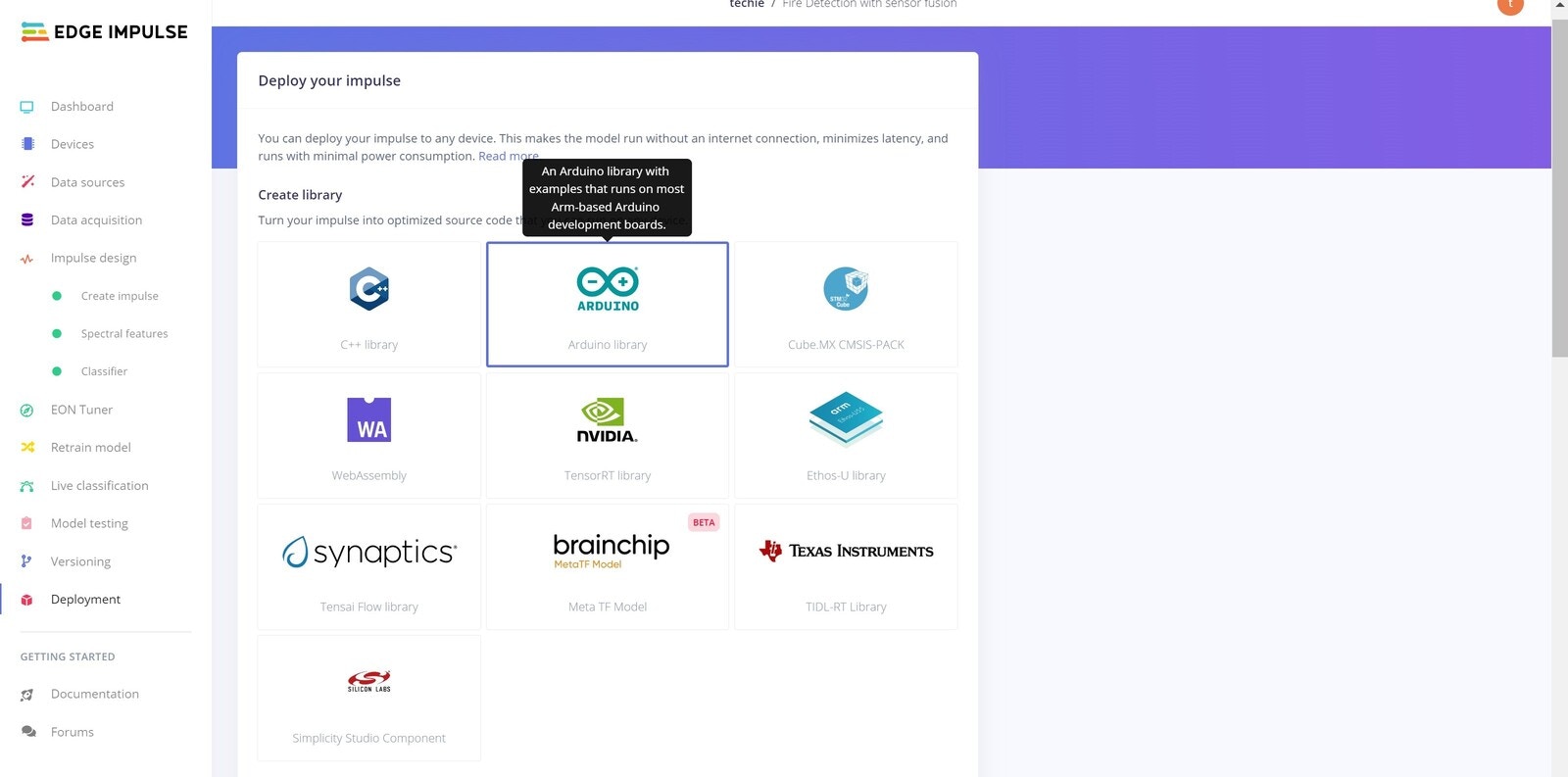 We deployed our model to the Arduino Nano 33 BLE Sense as an Arduino library. More information on the various deployment options are located here, but as we wanted to build some additional capabilities for alerting and notifications, we decided on using the Arduino library download option.