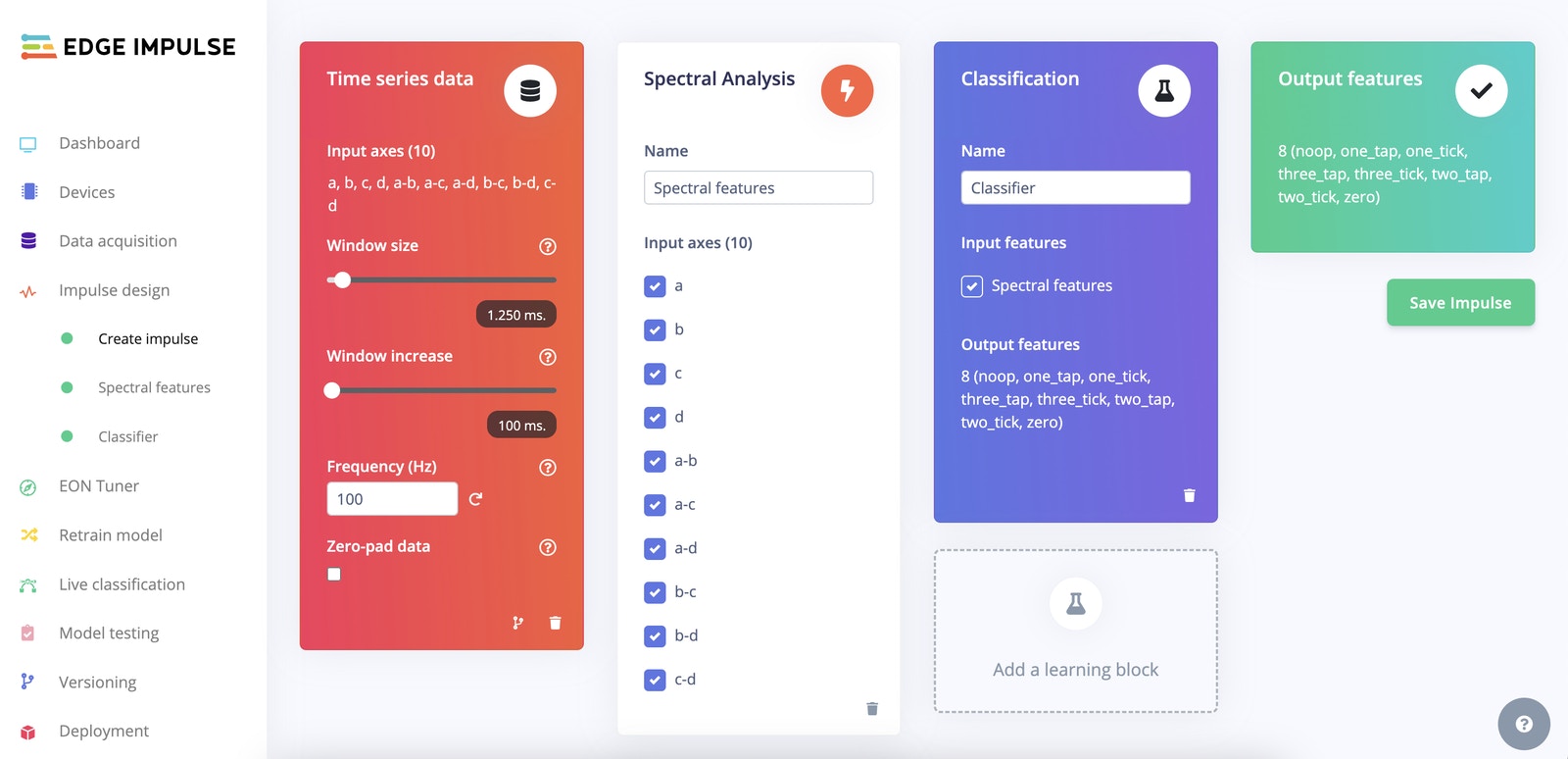 Our data is a multi-axis time series. This usually means the processing block will be made of Spectral Features (FFT frequencies and their power spectrum). For the Classifier, I opted for a fully connected network with 2 layers. As you can see from the confusion matrix, you can expect to achieve a very high score on all the gestures.