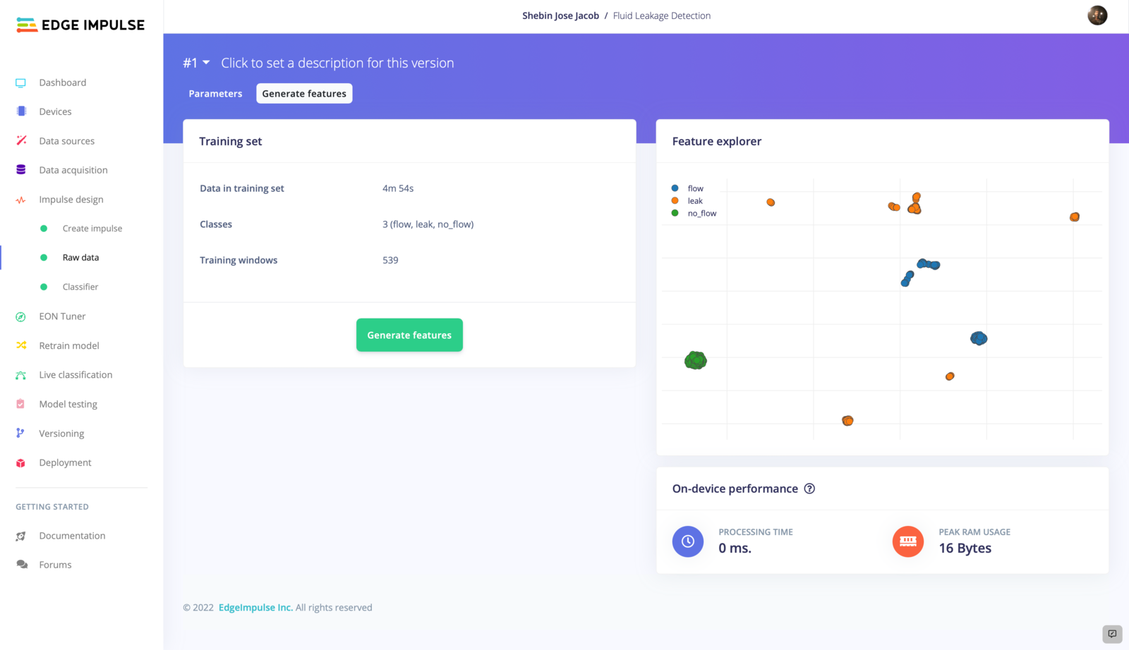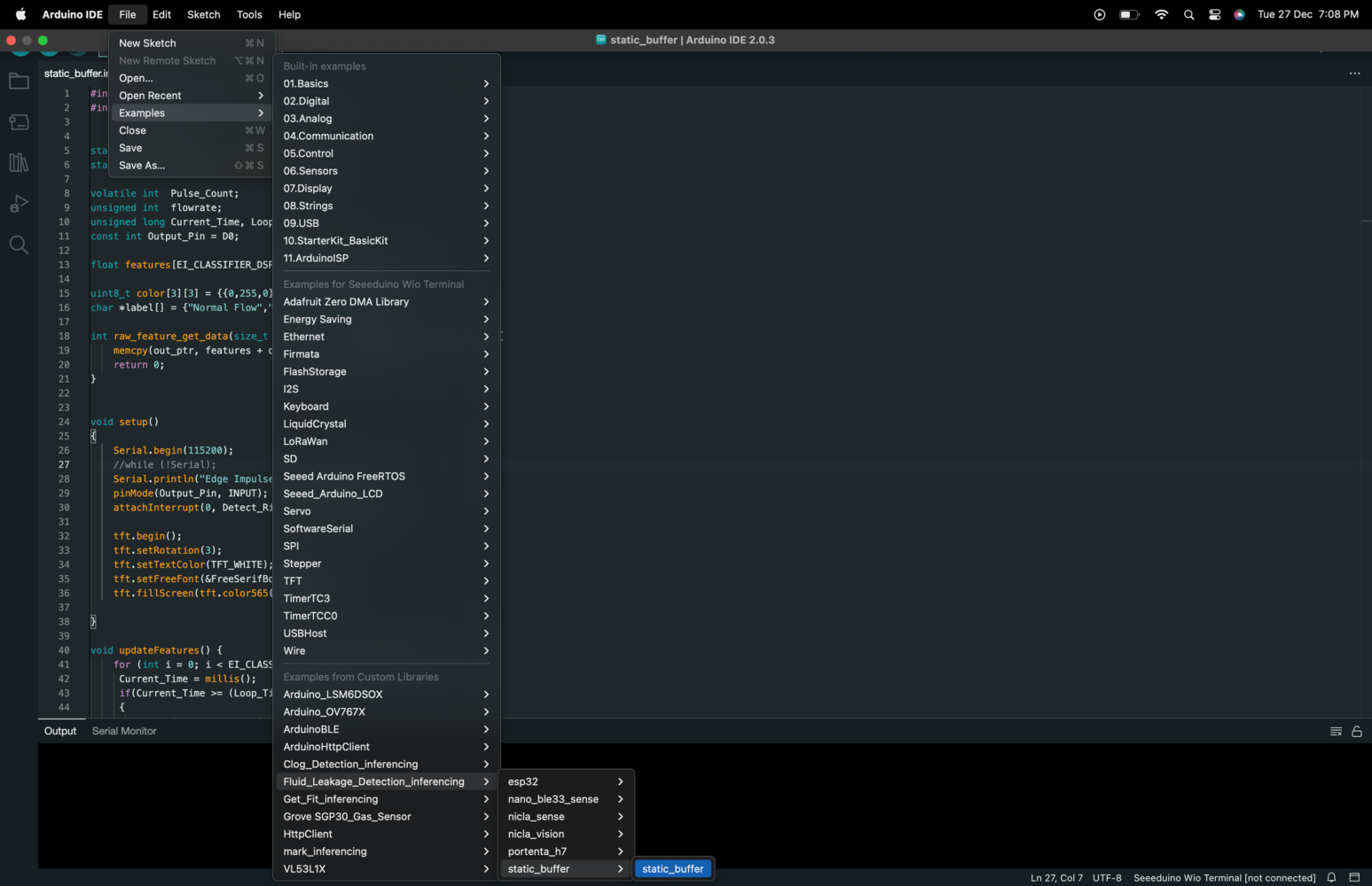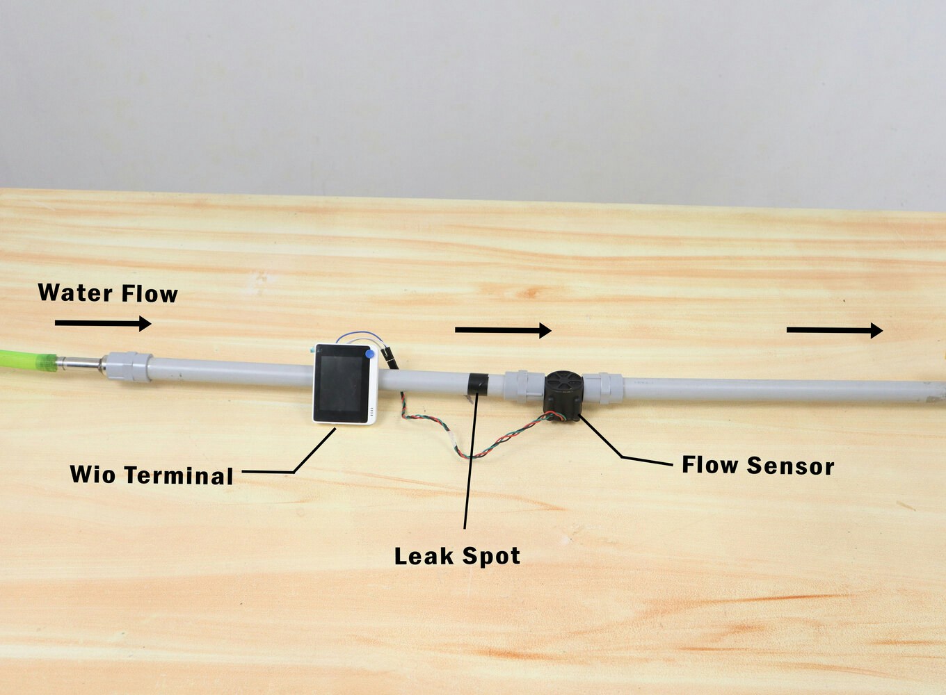 We have the water flow sensor which outputs a PWM signal. So instead of collecting the analog values from the sensor, we calculated the flow rate using an equation and it is collected as the time series data. We have collected the flow rates for no flow, normal flow, and leak which seem to be distinguishable by the model. To collect data for your project, follow these steps:- Upload DataCollection.ino to Wio Terminal.