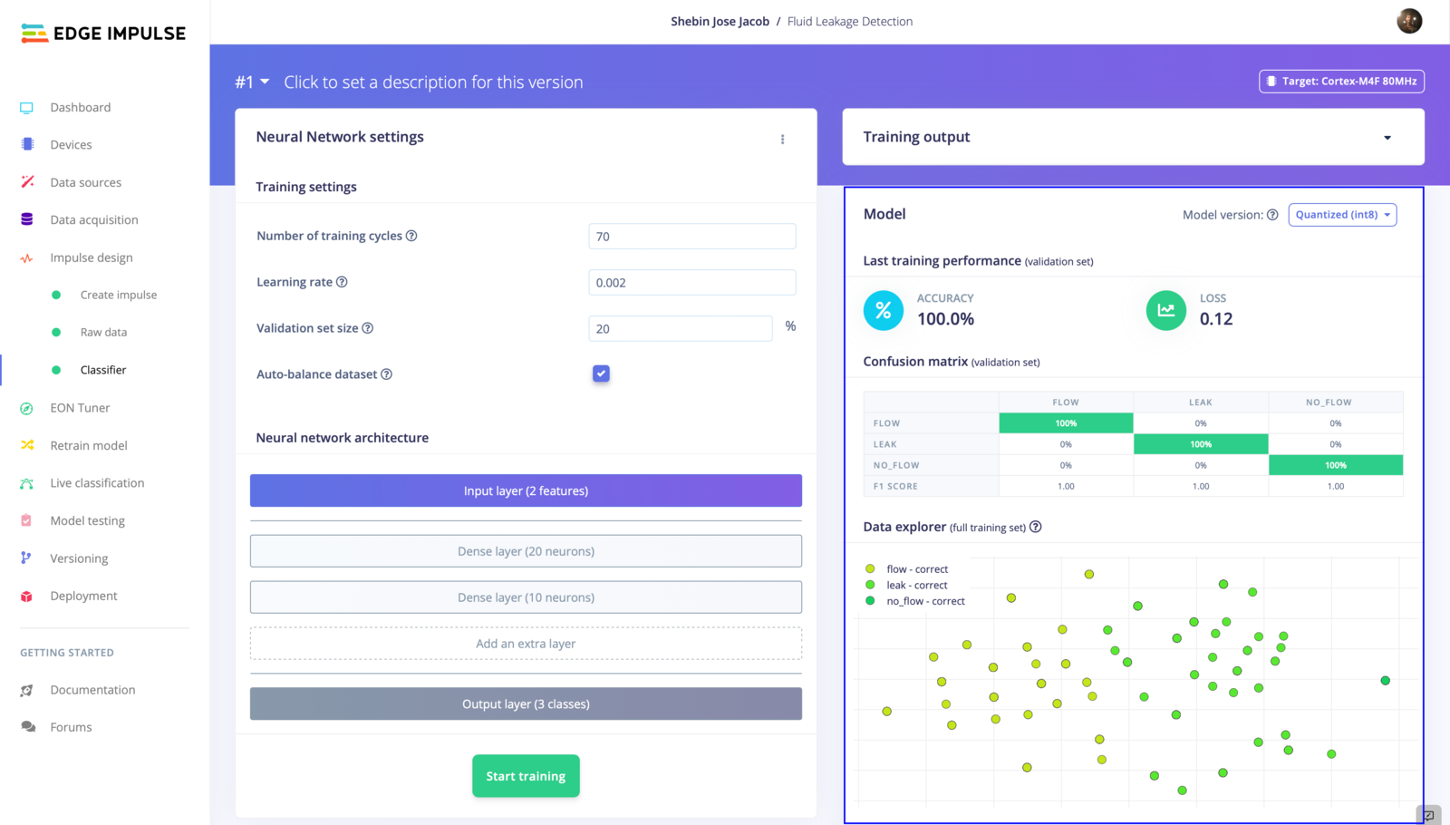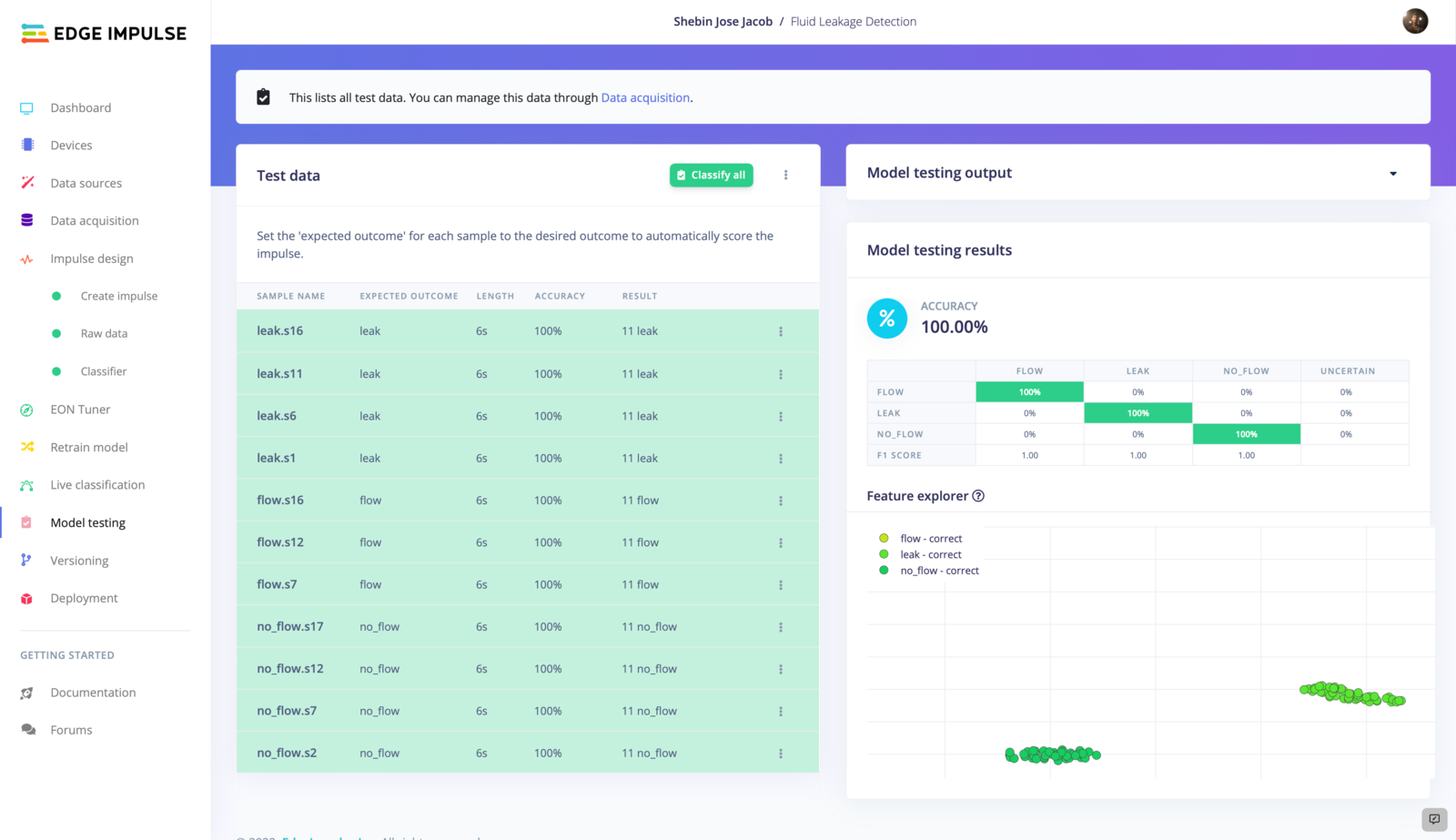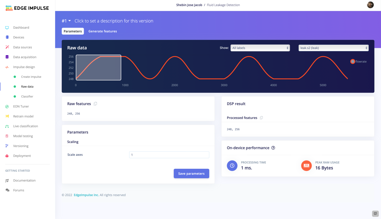 We have the water flow sensor which outputs a PWM signal. So instead of collecting the analog values from the sensor, we calculated the flow rate using an equation and it is collected as the time series data. We have collected the flow rates for no flow, normal flow, and leak which seem to be distinguishable by the model. To collect data for your project, follow these steps:- Upload DataCollection.ino to Wio Terminal.