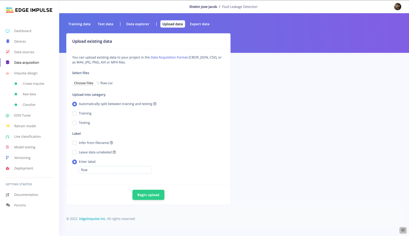- Upload the CSV file to Edge Impulse using the Data Acquisition Tab.