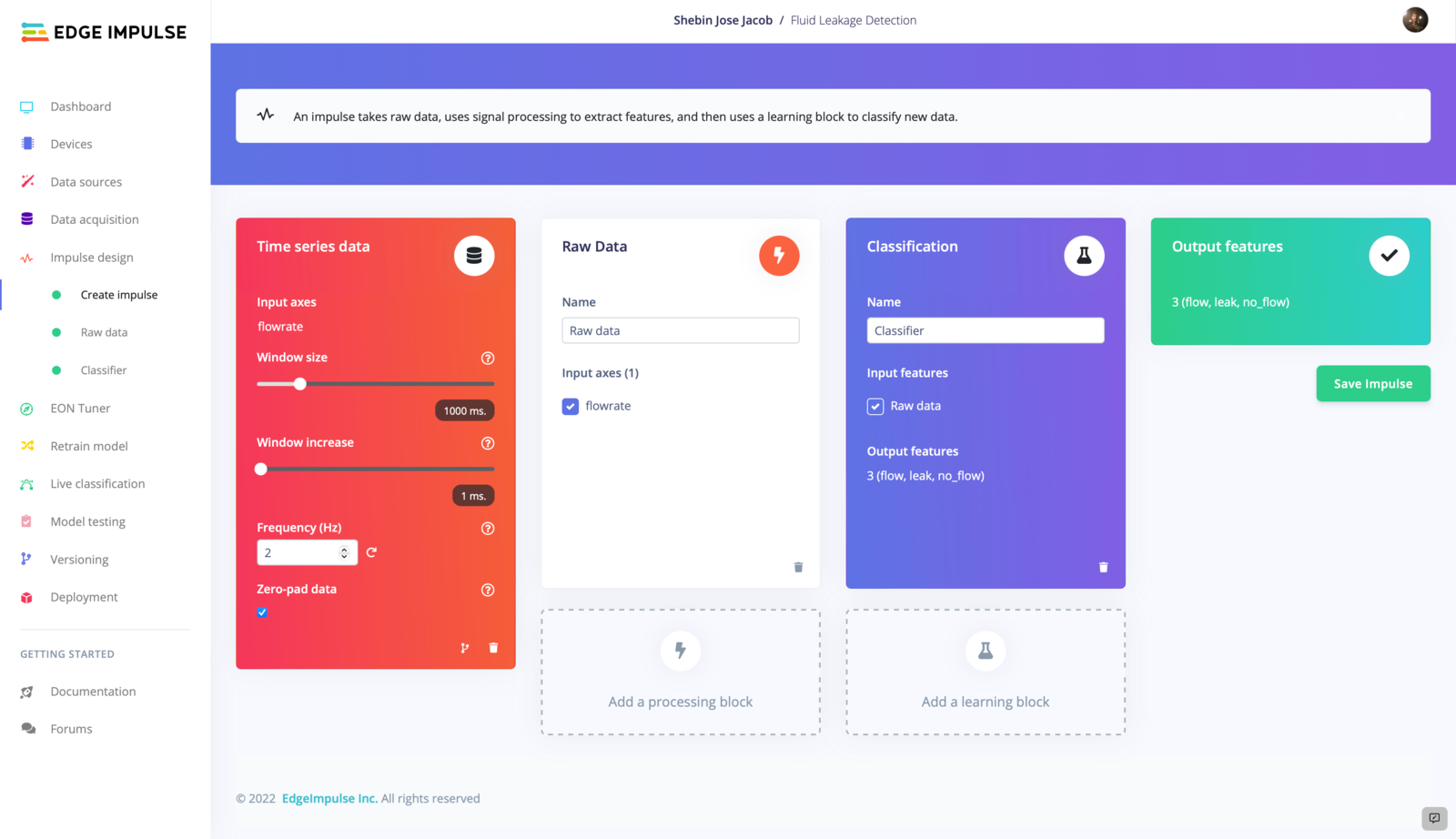 An impulse is a machine learning pipeline that takes raw data, does signal processing to extract features, and then employs a learning block to categorize new data.