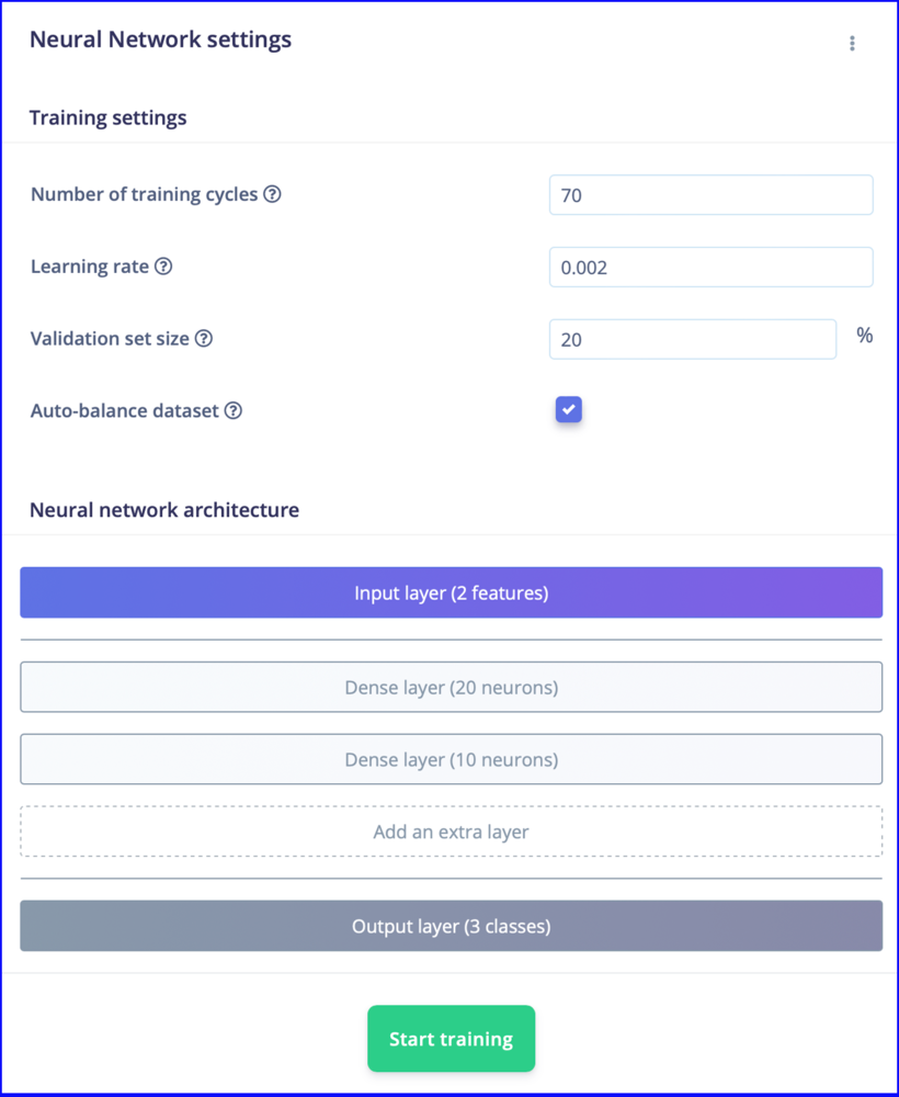Move on to the Classifier tab. Here we have 3 parameters to modify. First, leave the settings as it is and train the model once. In our case, it output a model with 30% training accuracy. So we tweaked the parameters many times until satisfactory training accuracy is attained. These are our Neural Network settings.