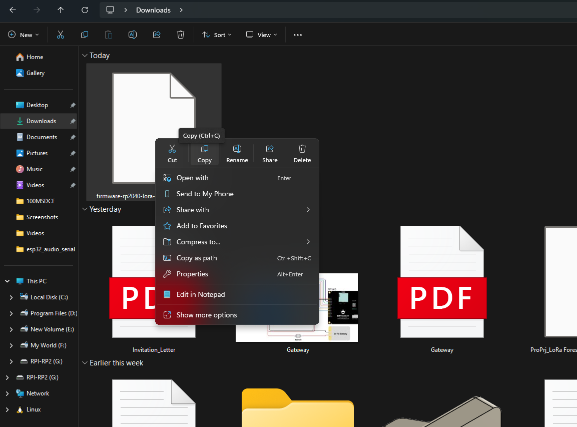 - Copy the downloaded .UF2 file into the RP2 drive.