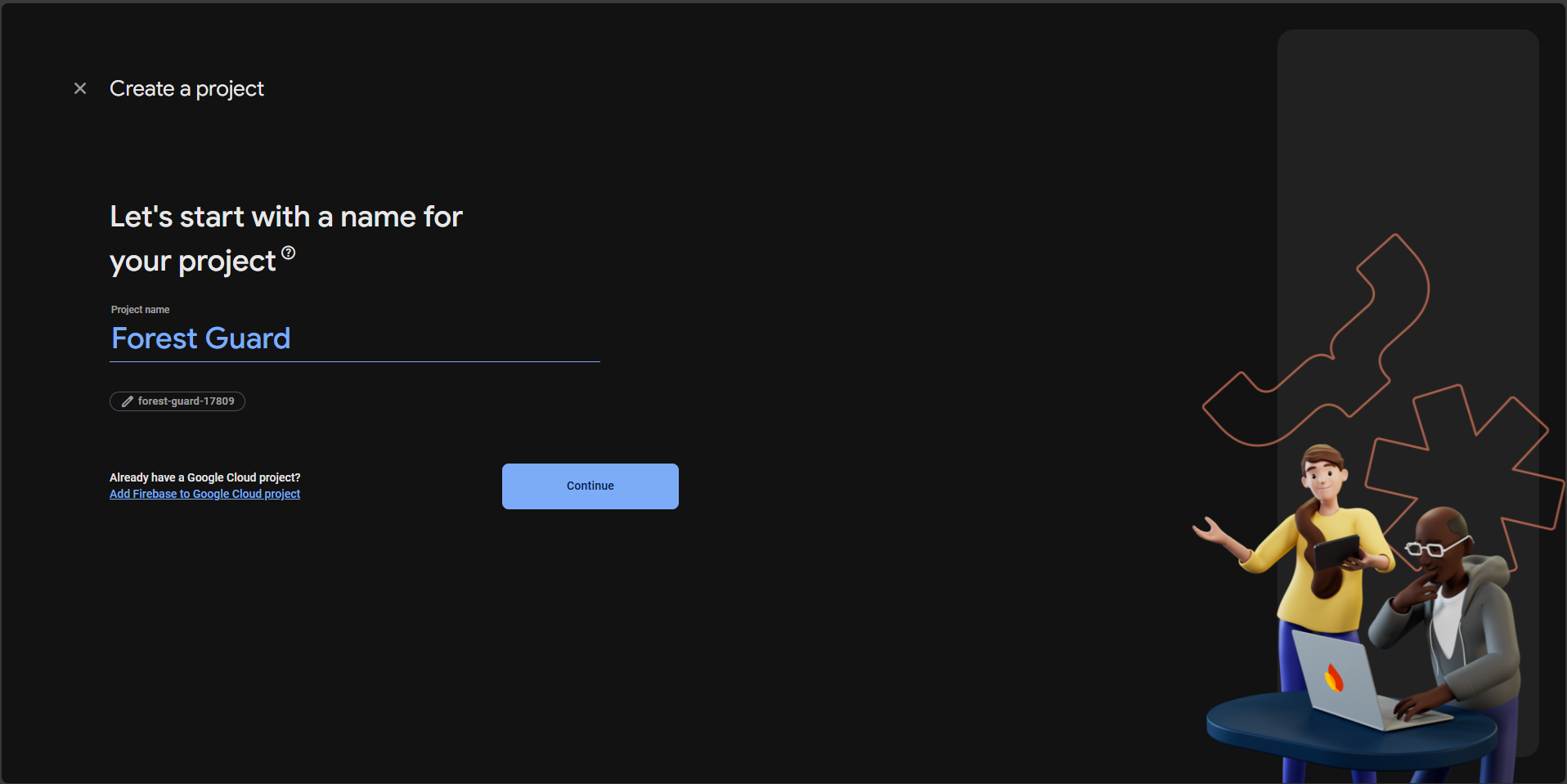 - Create project → (Google Analytics optional; you can keep default).