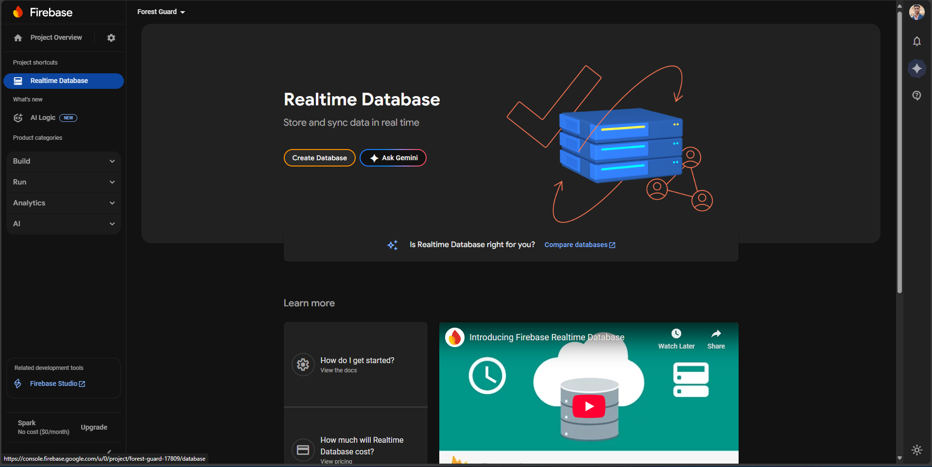 - Left sidebar → Build → Realtime Database → Create Database
