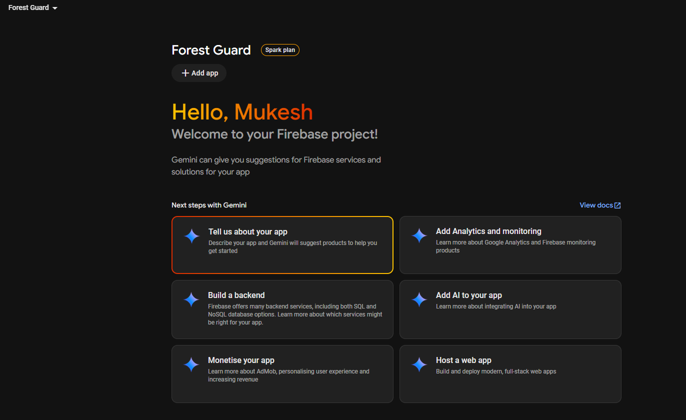 To visualize the data coming from the Forest Guard Nodes, I built a custom web dashboard using Lovable.dev. This dashboard connects directly to Firebase and provides both a quick overview and detailed insights into the forest monitoring network. Forest Guard Dashboard Setup- When the dashboard is first opened, it takes you to a Firebase configuration page.