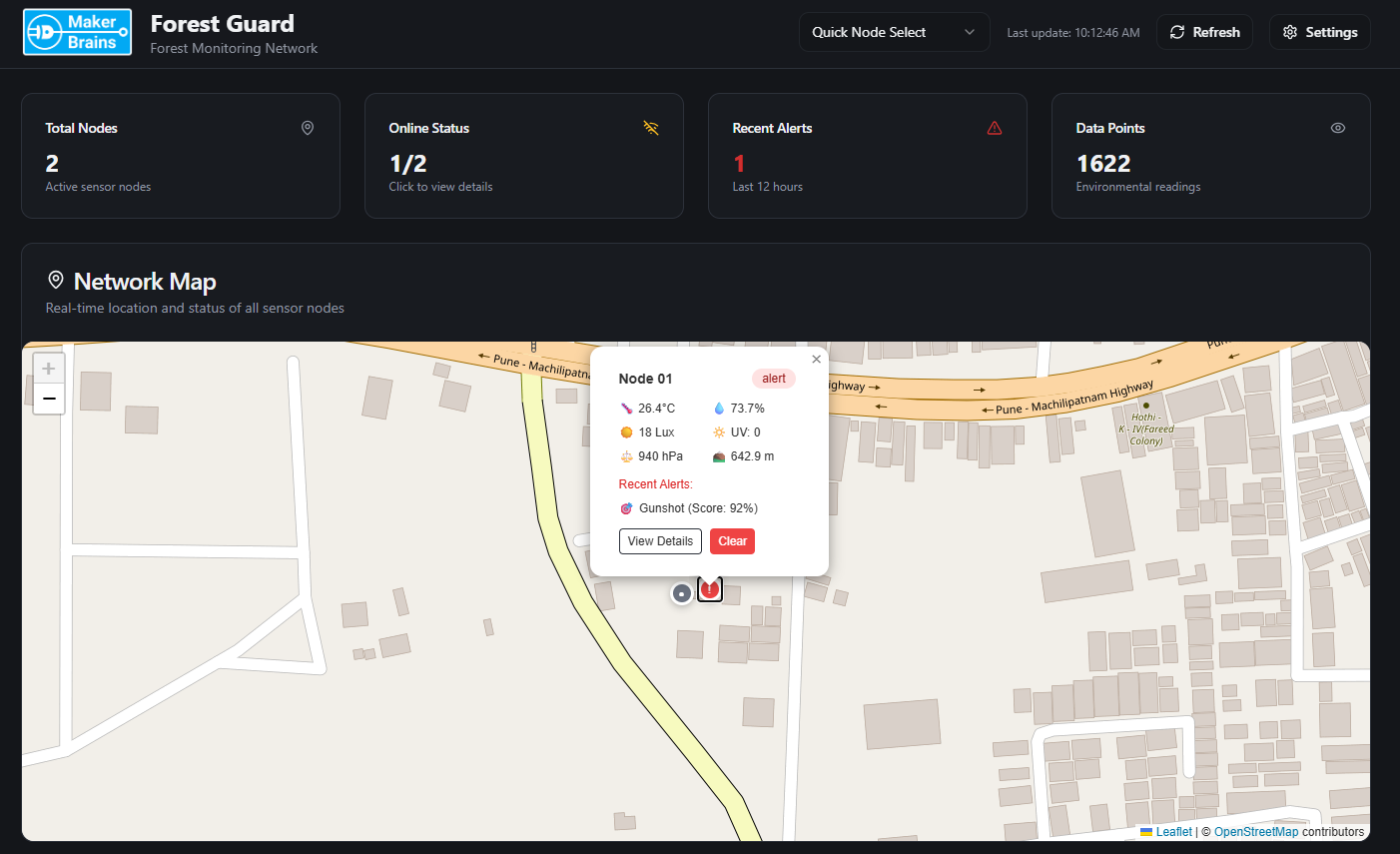 When an anomaly is detected, the alert propagates through the LoRa mesh to a gateway node, which syncs with the cloud when internet is available. The data is visualized on a web-based dashboard, showing sensor activity, live alerts, and precise node locations on a map.