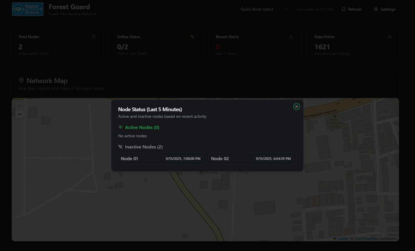 - By clicking on a node, you can quickly check its latest sensor data and status.