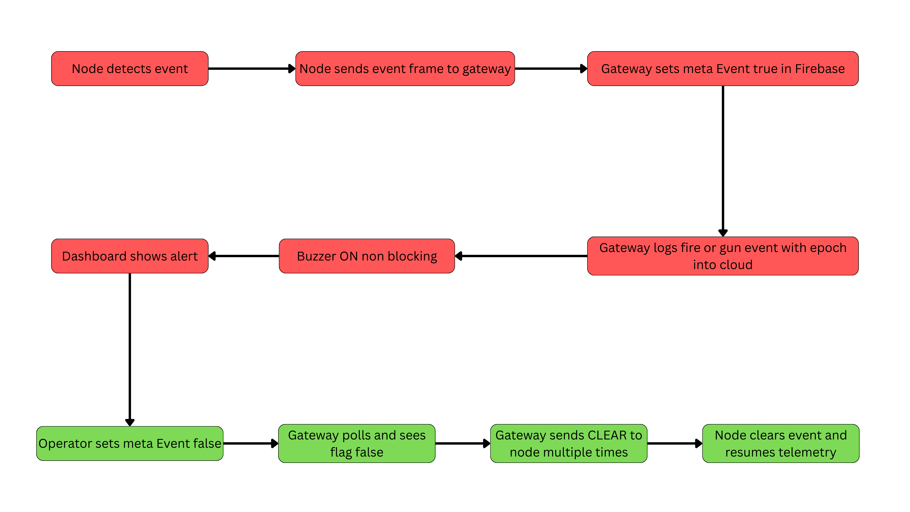 - Red → Alert (fire or gunshot detected)