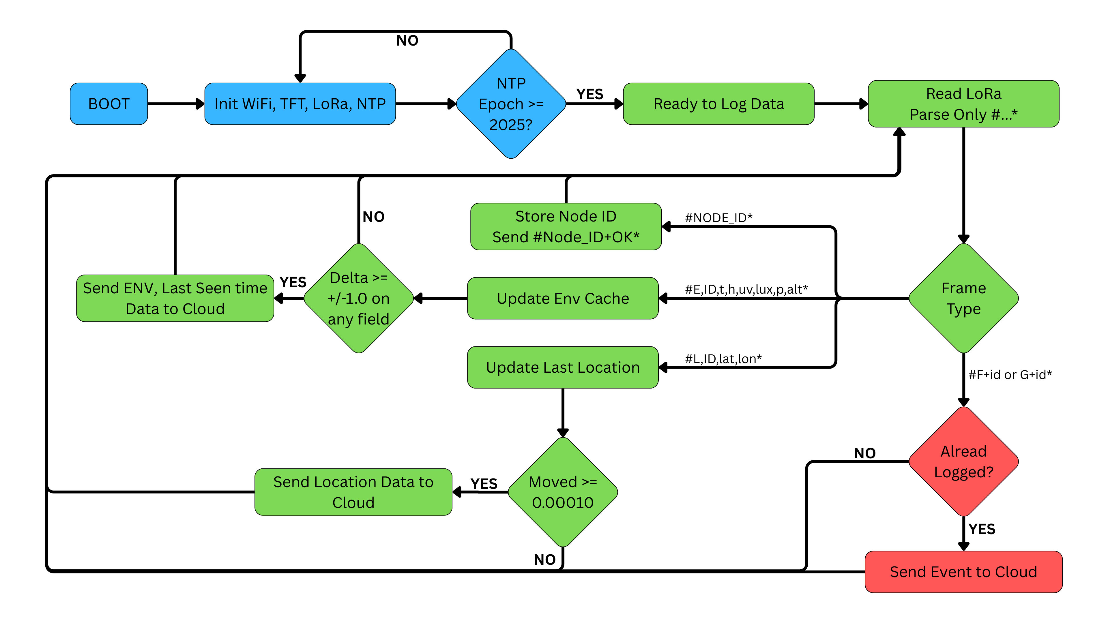- Blue: boot/LoRa/registration