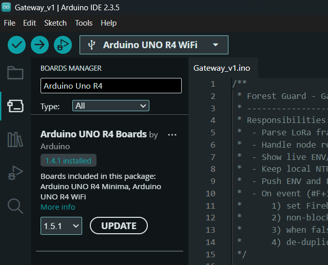 - Make sure the Arduino Uno R4 WiFi board package is installed via Board Manager.