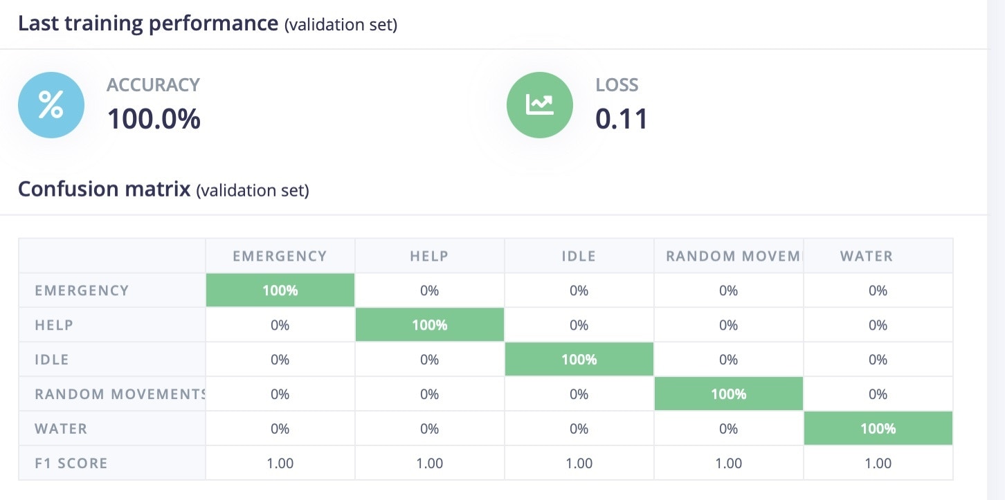 After training, the model achieved 100% accuracy, and the F1 score is listed below: