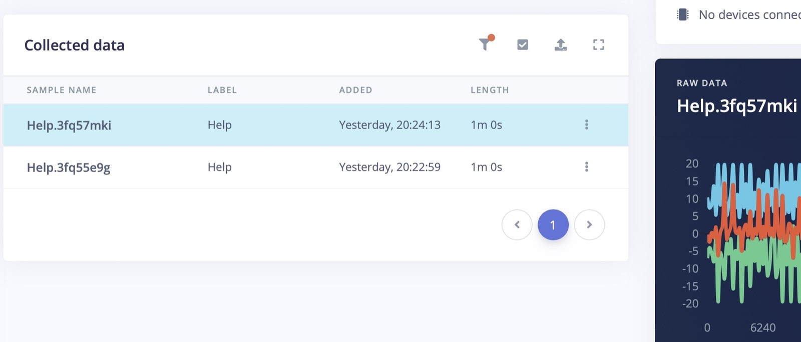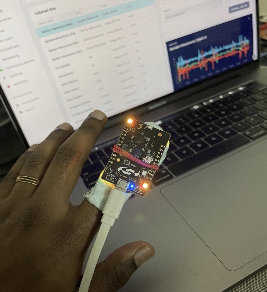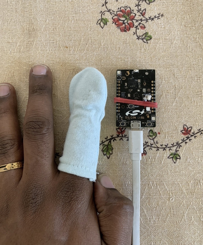 Now your board is connected to your Edge Impulse account. I have used a cloth finger cover and attached the SiLabs board with a rubber band.