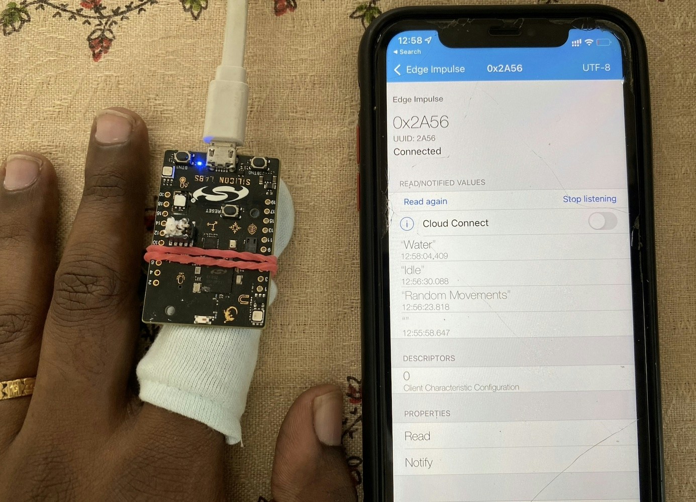 I have created a wearable using a SiLabs Thunderboard Sense 2, which can be fitted to the patient’s finger. The patient can call the caretakers by tapping their finger, or rotating it, and the tinyML model running on the hardware will predict the gesture and communicate to the caretakers through BLE communication. The caretakers can get notified in the Light Blue Application on their devices.