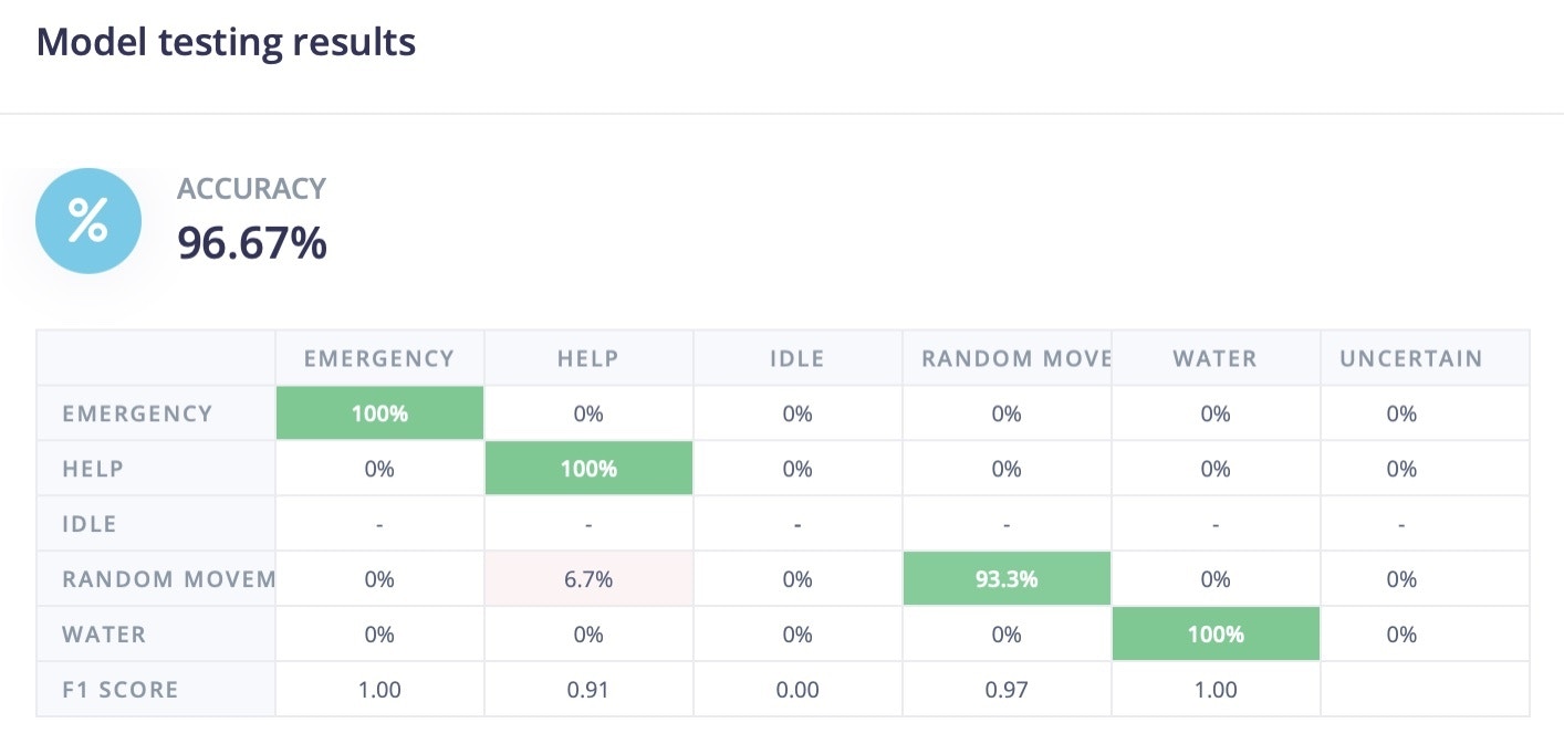 In Model testing, I have used the Testing data that we set aside earlier. The model achieved 96% in model testing data. This data was completely new and not used in training sessions. The decrease in model accuracy that we noticed does sometimes happen, in this case it looks like some of the “Random” movements were identified as “Help” actions.