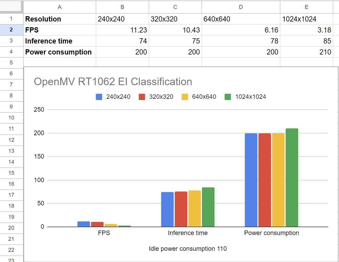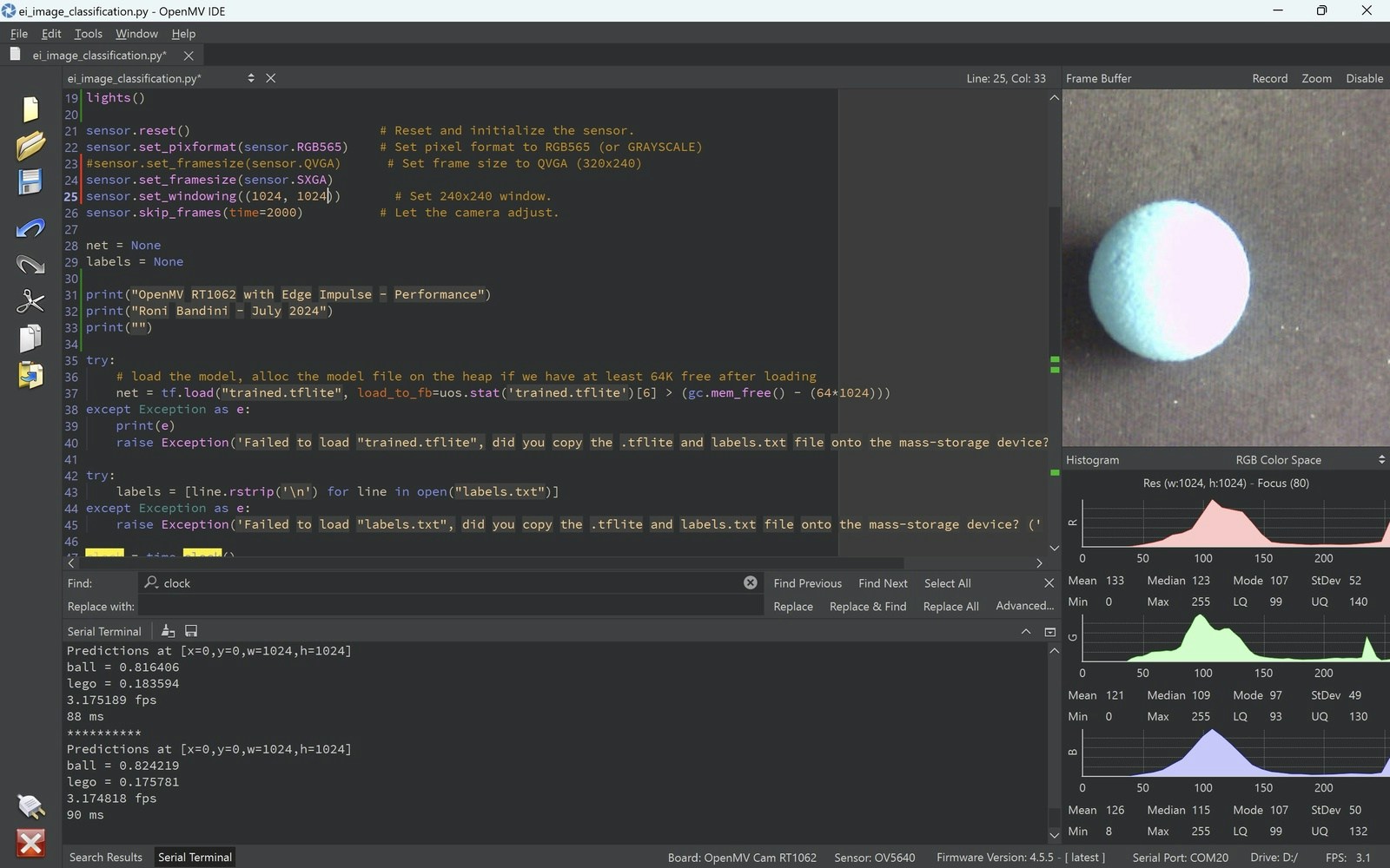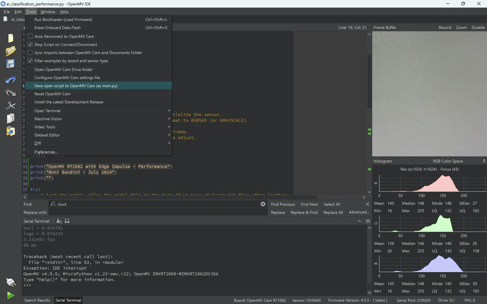 I have downloaded the OpenMV IDE from https://openmv.io/pages/download. The IDE is available for Windows, Mac and Ubuntu Linux. I have created a MicroPython script based on the example classification script included in the .zip file, but with small modifications to measure inference time.