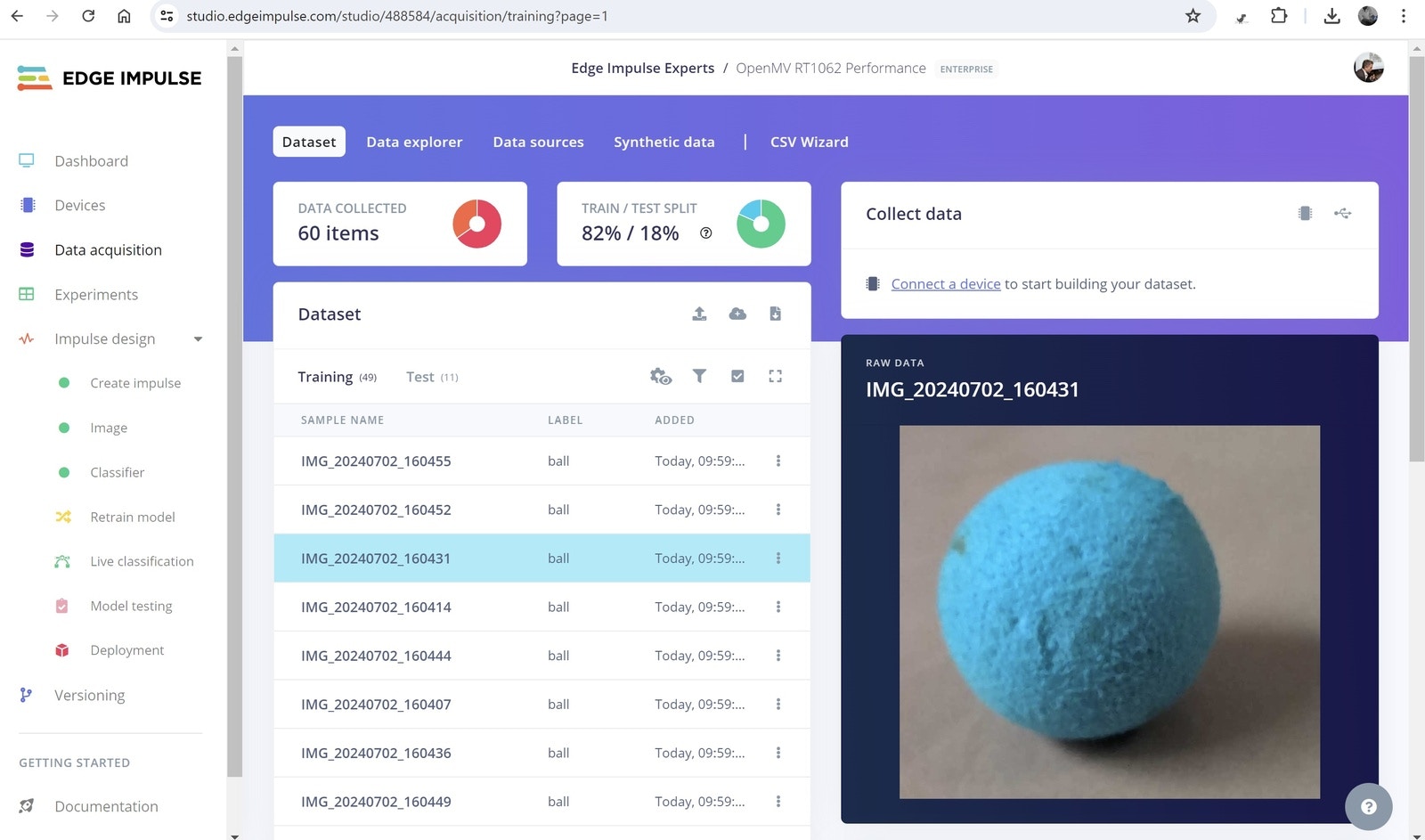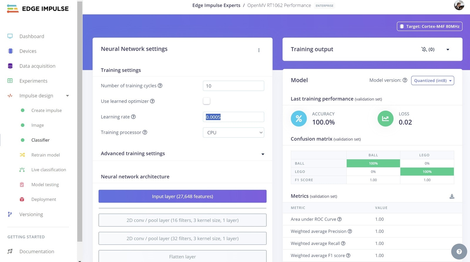 For this project I have trained a simple classification model using Edge Impulse. I took 30 pictures of a Lego figure and 30 pictures of a small blue ball. I have created an Impulse with 96x96 px images and a Classification Learning Block. These items are very distinct from one another so the classification is quite easy from a machine learning perspective, but that is because we are more interested in evaluating the performance and ease of use of the OpenMV RT1062 here. In the future we could always explore more difficult ML tasks.