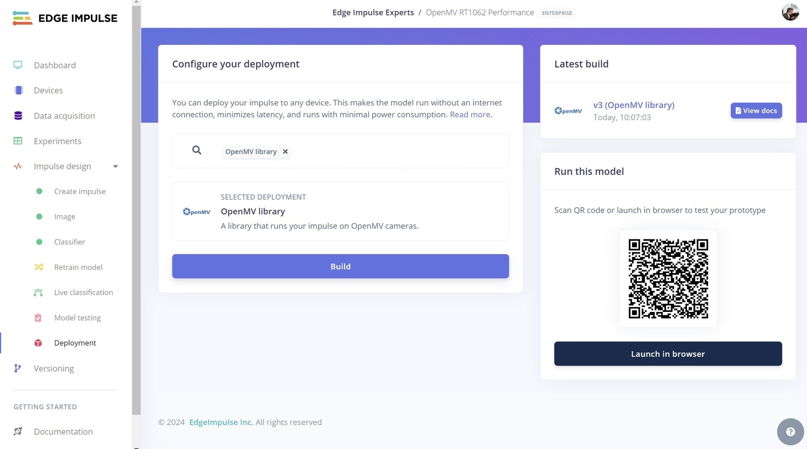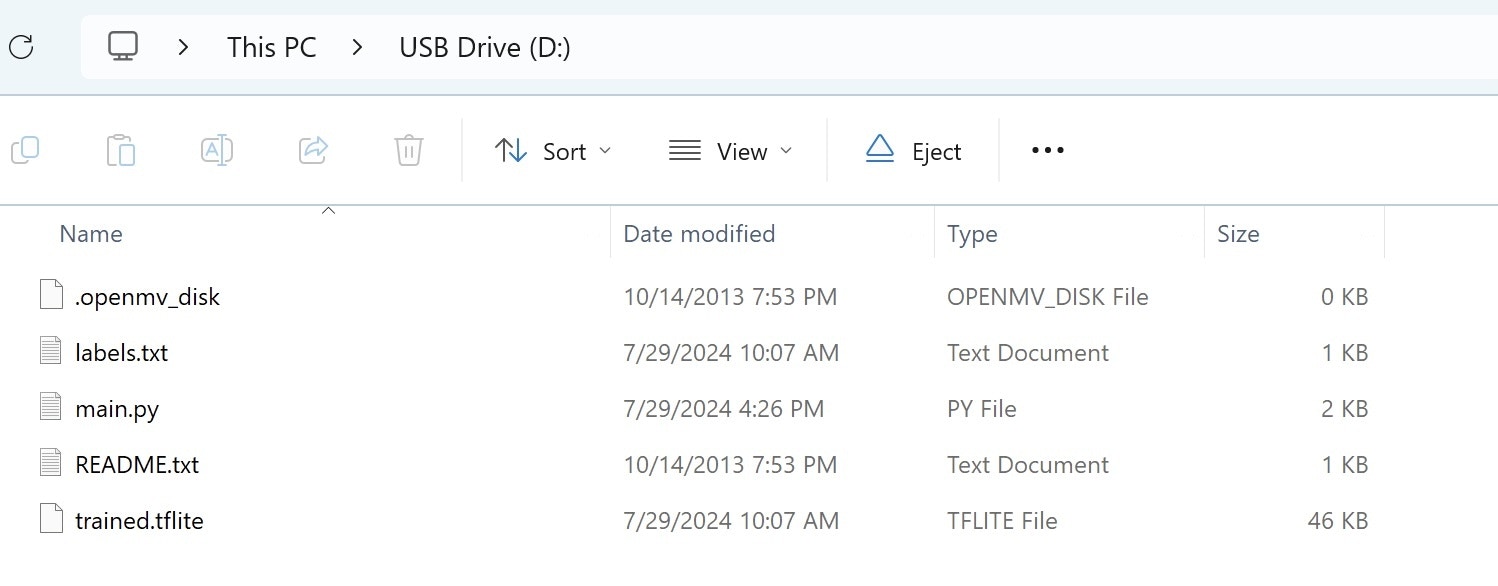 .zip file that was generated and downloaded. I connected the OpenMV camera to my computer with a USB-C cable, and copied the labels.txt and trained .tflite files to the camera, which conveniently exposes itself as a USB drive when connected.