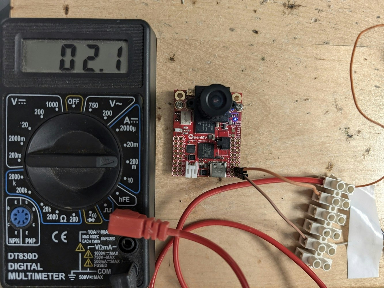 The OpenMV FAQs state that the OpenMV Cam consumes about 100 mA while idle, and 140 mA when processing images. However, it’s important to note that there are several OpenMV Cam models (such as the RT1062, H7 Plus, and H7 R2) and ML inferences could increase the power consumption, so I soldered two headers to VIN and GND pins and I put a Multimeter in series with the power lines to make my own tests.