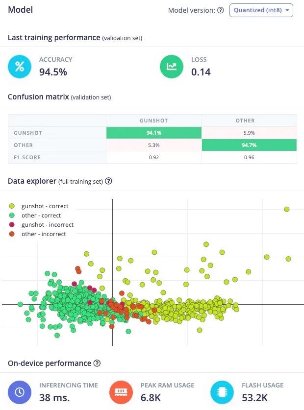 The machine learning module uses a tinyML algorithm prepared using Edge Impulse. This module is responsible for identifying gunshot sounds. It takes sound as input and outputs its classification.Dataset