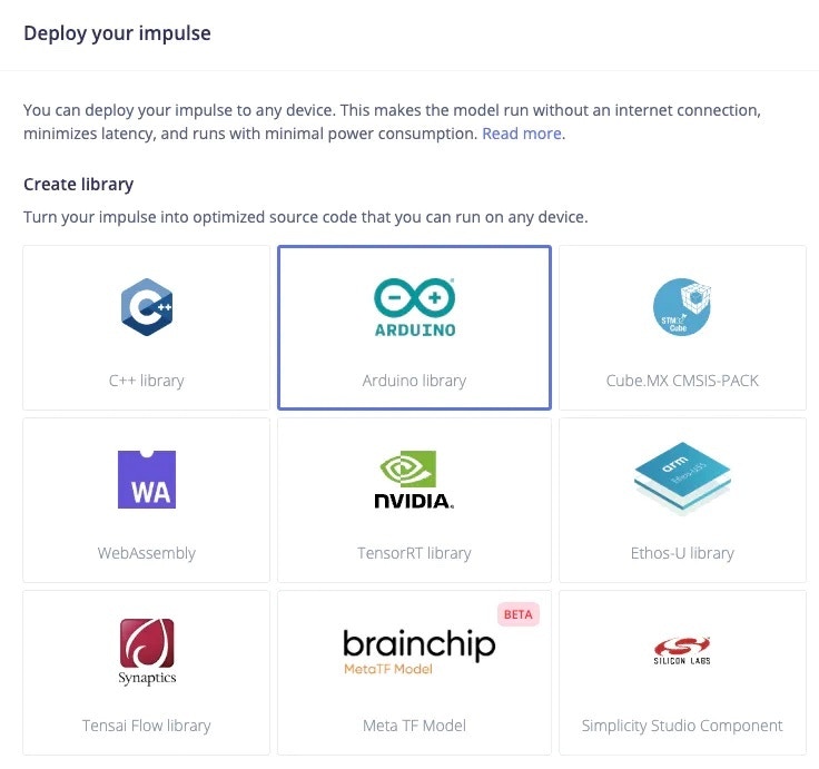 After completing the training, it’s time for deployment. The Deployment tab of the Edge Impulse Studio provides three main ways of deploying the model onto hardware: (a) by creating a library (b) by building firmware, and (c) by running it on a computer or a mobile phone directly. I knew that I need more functionality from my Arduino hardware apart from inferencing, so I created a library instead of building firmware.