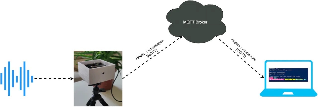 My testing setup and the result are illustrated in the video below. The system is connected to my laptop which is also performing the screen recording. On the upper left side, we have an Arduino serial window which is showing the output from the Portenta H7, and on the lower left hand, we have an audio player. On the right-hand side, we have cloudMQTT’s WebSocket UI, which shows the incoming notification via MQTT. The sound for this video is played and recorded using my laptop’s speaker and microphone.