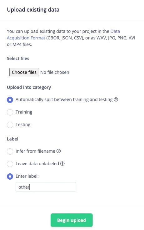 One of the most important parts of any machine learning model is its dataset. In this project, I have used a combination of two different datasets. For the gunshot class, I used the Gunshot audio dataset and for the other class, I used the UrbanSound8K dataset from Kaggle. Edge Impulse Studio’s Data acquisition tab provides useful features to either record your own data or upload already-collected datasets. I used the upload feature.