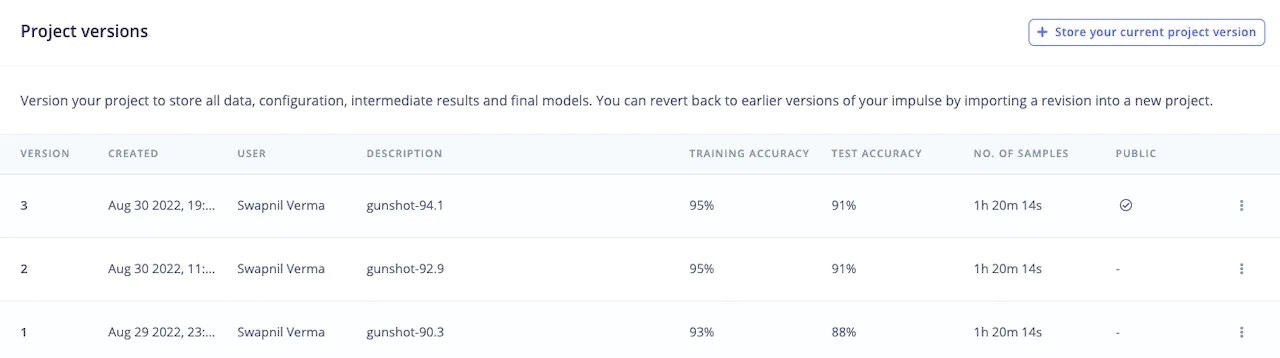 One nice feature Edge Impulse provides is versioning. You can version your project (like Git) to store all data, configuration, intermediate results and final models. You can revert back to earlier versions of your impulse by importing a revision into a new project. I use this feature every time before changing the neural network architecture. That way I don’t have to retrain or keep a manual record of the previous architecture.