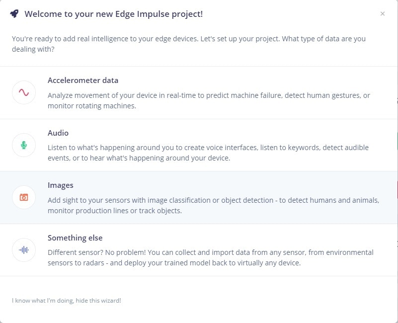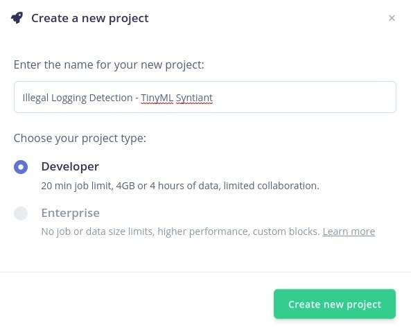Let’s start by creating an Edge Impulse project. Register an account with Edge Impulse. Select Developer as your project type, click Create new project, and then give it a memorable name.