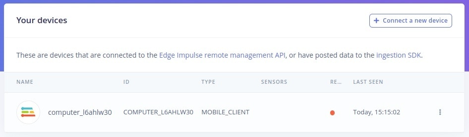 To connect the Syntiant TinyML to Edge Impulse, download the Audio firmware archive. Put the board in boot mode by double-clicking on the reset button when connecting the board to your computer, while the orange LED is blinking. In boot mode, you should see the red LED fading on and off. Then flash the firmware by running the script for your OS from the archive:Creating an Edge Impulse Project