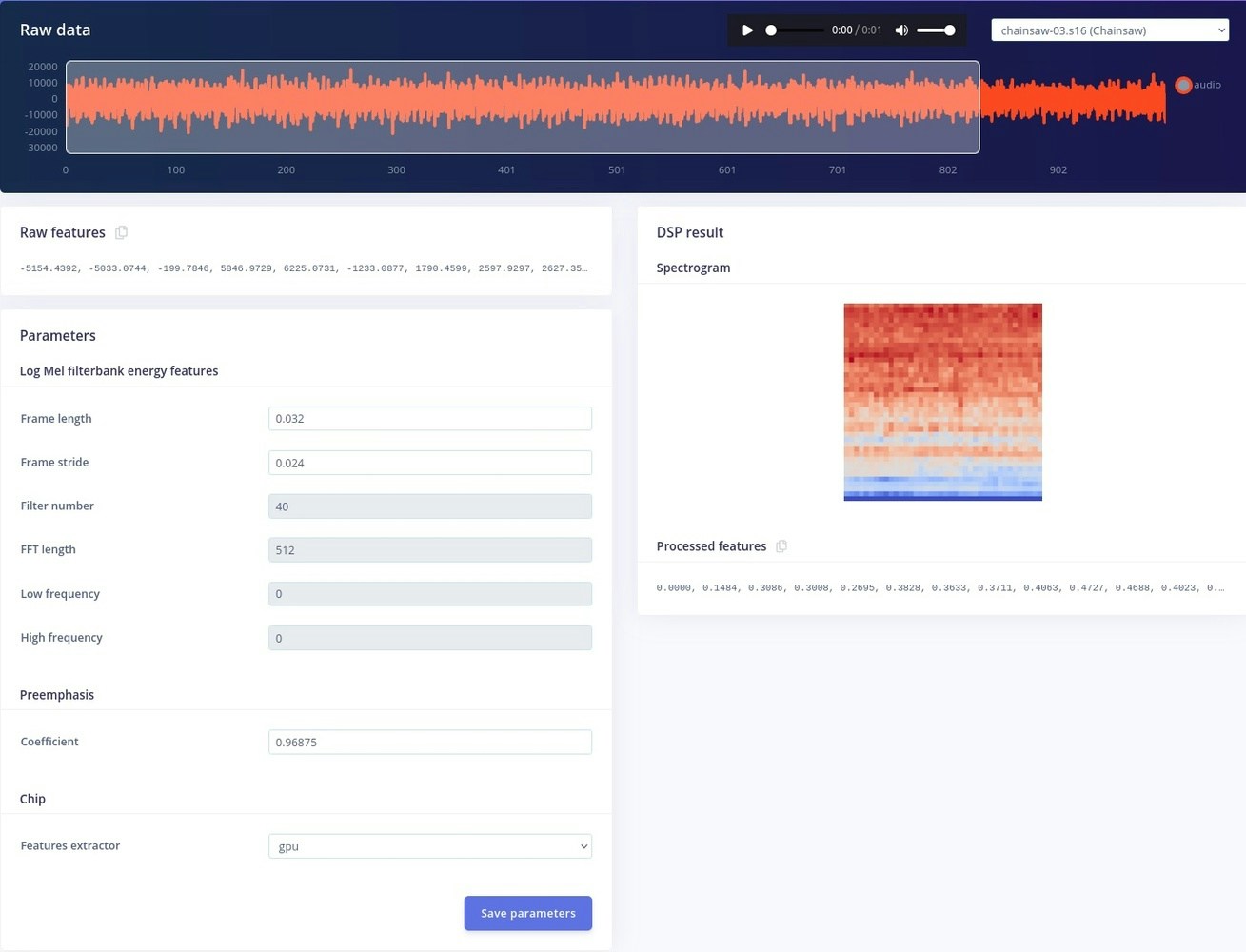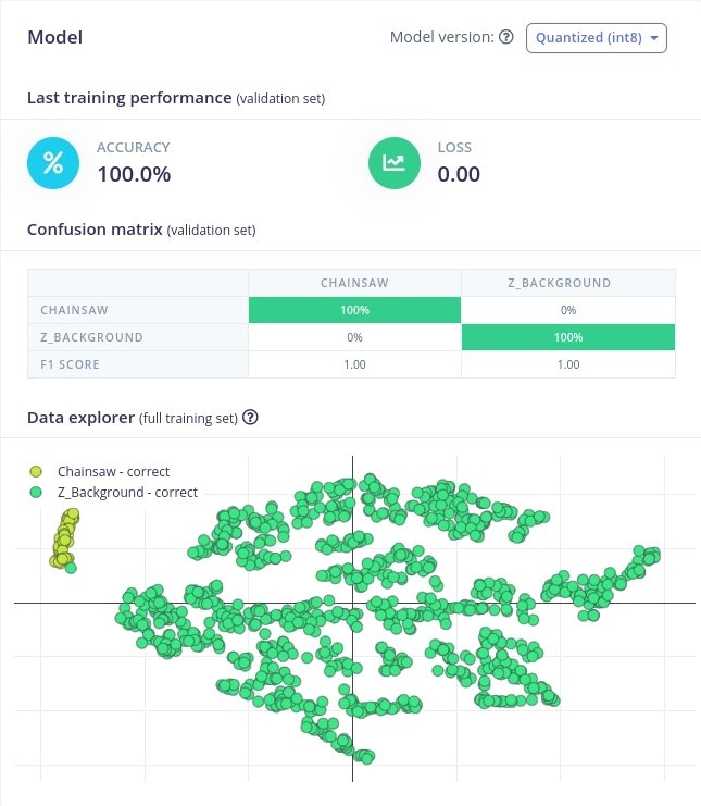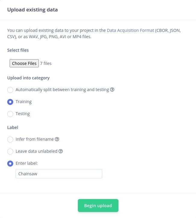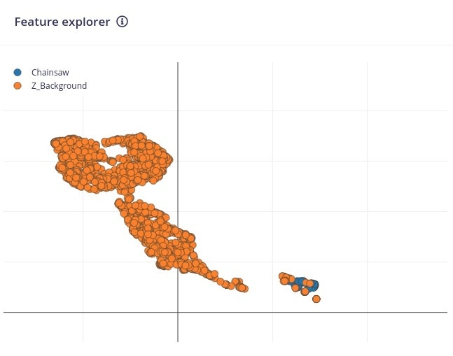 Sometimes, gathering relevant data for your TinyML model might be a complicated endeavor, just like in this case. This is a situation in which the Upload data function under the Data acquisition tab saves the day. What it allows you to do is use publicly available recordings of the phenomena you wish to identify and use them as training data for your model. In this case, what you must do is find publicly available recordings of chainsaws (in WAV format) and download them. Navigate to the Upload data menu, click on Choose Files and select your files, select Training as the upload category and manually enter the “Chainsaw” Label and click Begin upload. It’s important to upload data that corresponds to background or unknown sounds because the NDP101 chip expects one and only negative class and it should be the last in the list, that we will be naming Z_Background. For this, we will be using the Noise and Unknown dataset that can be found in the Keyword Dataset, which we will label Z_Background.