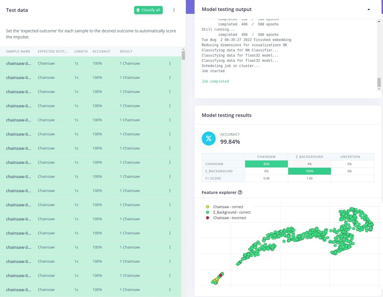 Navigating to the Model Testing page is a wonderful method to start testing our model before deployment. The samples kept in the Testing data pool will be displayed to you. To run all of this data through your impulse, select Classify all.