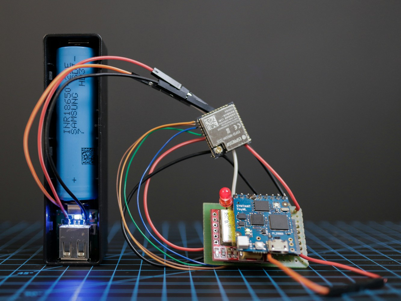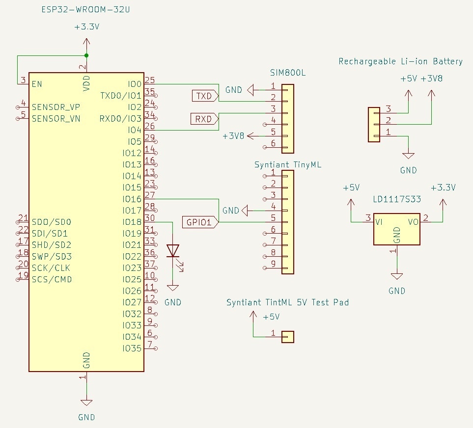 As stated before, our choice of Edge computing hardware for this use case is the Syntiant TinyML board, designed for working with Syntiant’s Neural Decision Processors (NDPs). This development board is a powerful tool for developing and deploying Machine Learning algorithms, as it is equipped with an ARM Cortex-M4 processor, which allows for real-time inference of the trained Machine Learning model. Another advantage of this Syntiant board is that it is equipped with 5 GPIOs that enable it to interact with other external circuitry and trigger an external output. Over the ML detection layer of our system, we will be adding a communication layer. In this case, we are using an external circuit based on the ESP32 MCU that can read a trigger from Syntiant TinyML, which is further interfaced with a SIM800L module, responsible for sending an SMS message to the user when chainsaw noise is detected. Be advised that the SIM800L is using 2G networks, in the EU there are still many providers for it and the coverage is way better for it in comparison with the speedier networks. Since we are deploying it in a forest it’s actually a good option for us. In the US the 2G networks are being phased out currently so be sure to check what GPRS module works best in your case.