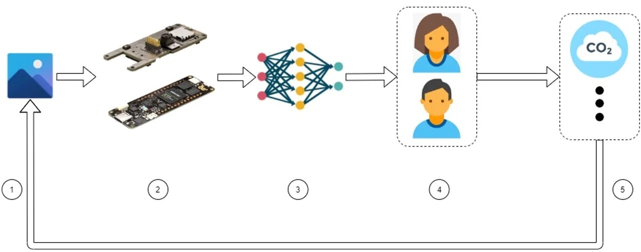 My solution uses a TinyML based algorithm to detect and count the people in an indoor environment. The algorithm will be deployed on a microcontroller. The microcontroller will capture an image or stream of images using a camera and then perform inference on the device to count people. The device can record the occupancy level locally or send it to a remote machine, possibly a server, for further evaluation. After counting the number of people in an indoor environment, we can do all sorts of things. For example, we can calculate the approximate CO2 level in the room, the distance b/w people to predict the infection risk [2], etc. In this project, I will focus on CO2 level estimation.Hardware
