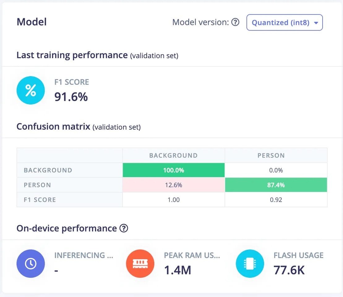 Training and testing are done using above mentioned PIROPO dataset. I used the FOMO architecture by the Edge Impulse to train this model. To prepare a model using FOMO, please follow this link.
