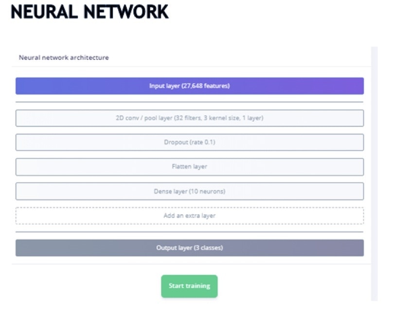 In “Neural Network”, I have used a single 2D convolution layer with flatten – DNN (10 neurons). The reason to go with one set of 2D Conv instead of more layers in 2D Conv, is memory consumption. Due to memory constraints on the device, I have one included one 2D Conv layer.