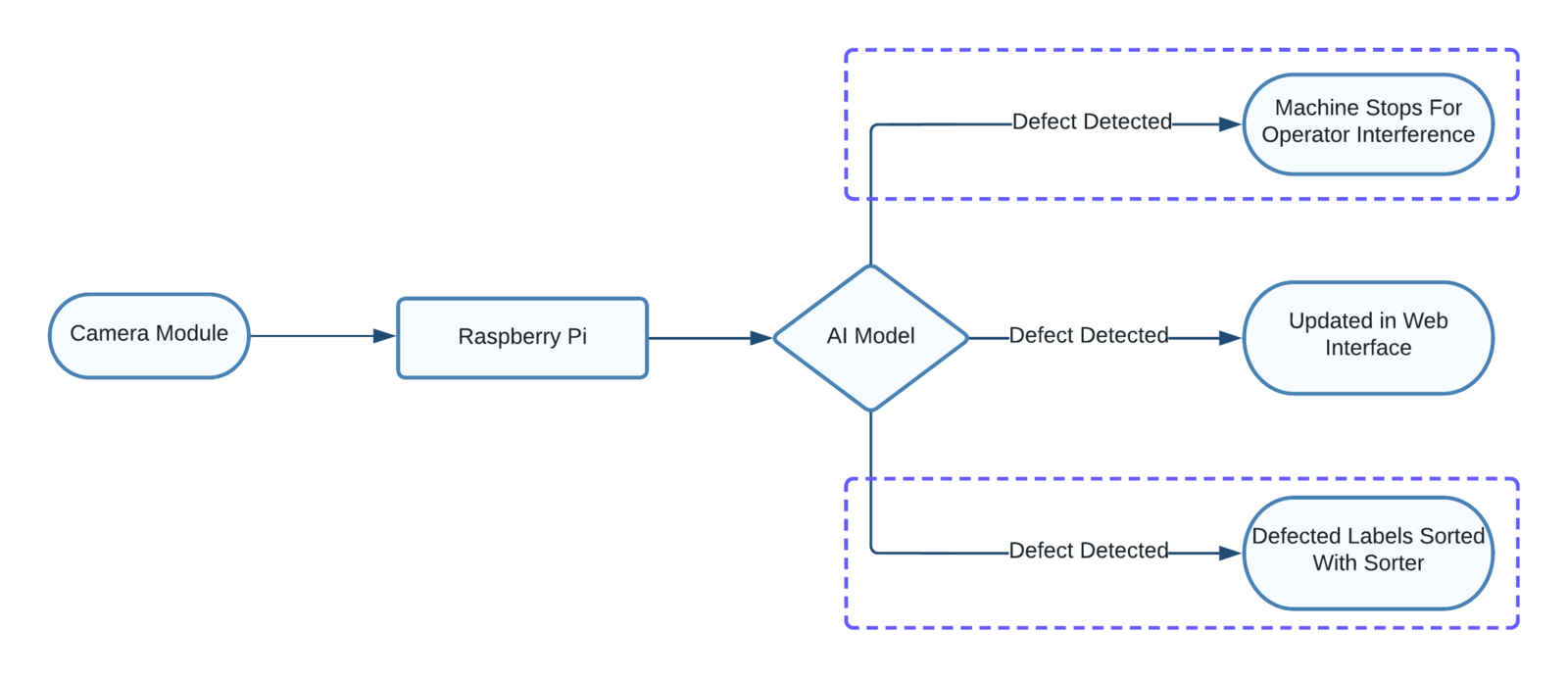Our system consists of a Raspberry Pi 4 along with a compatible 5 MP camera module. The system runs an AI model built using FOMO. The model is currently capable of detecting Ink Spills, Ink Smudges, Die Cutting, and Inverted Labels. More classes can be easily added and the system can be made more robust. If the system detects any of the known defects it generates an alert in a web interface, which can be easily monitored. This system can be easily tweaked in such a way that whenever a defect is detected in the printing machine itself, the machine is stopped instantaneously for operator assistance, which reduces the chance of any such defects due to machine error. Or, this system can be easily employed to categorize the defective labels from a collection of printed labels using a sorter device.