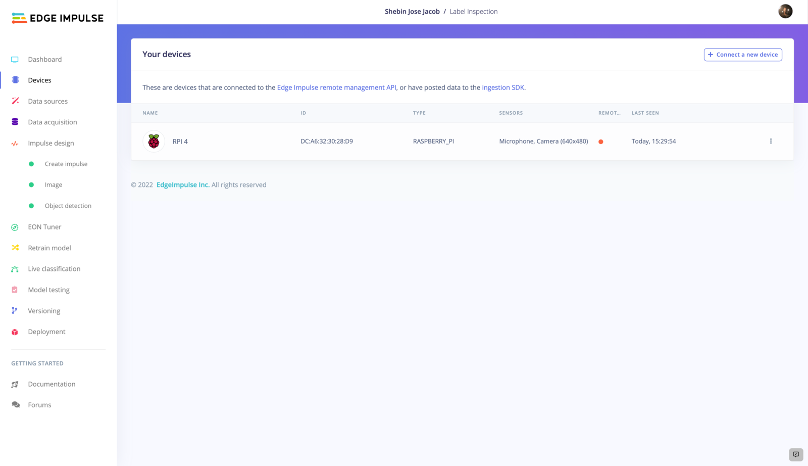 The Raspberry Pi 4 comes with a quick Getting Started Guide here, that will help you to set up Edge Impulse on your device. Follow the instructions and get your device connected to the Edge Impulse Dashboard.