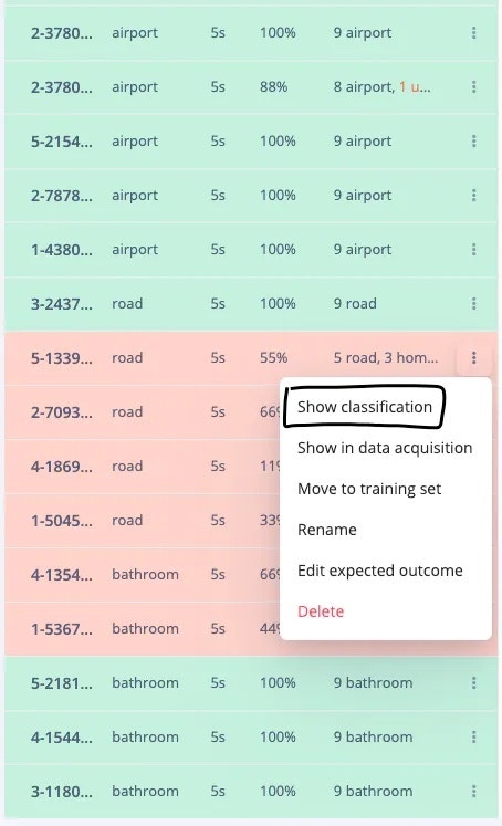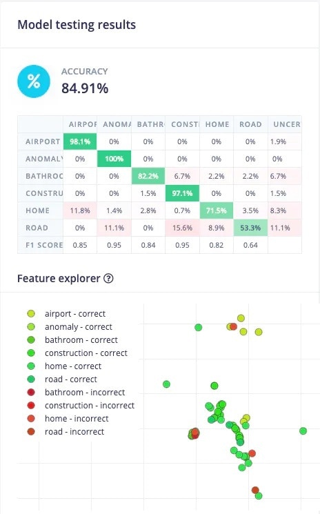 To test the model, jump over to the Model testing tab and click on Classify all. It will automatically pre-process and perform inferencing on the set-aside data, using the last trained model. The testing performance of the model in my case is 84.91%.