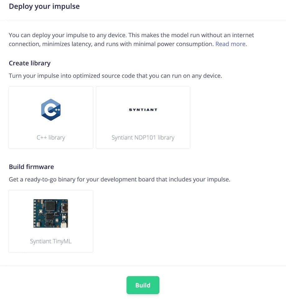 To deploy the model to the target hardware (Syntiant TinyML in this case), go to the Deployment tab. The Syntiant TinyML board requires finding posterior parameters before building firmware. For other hardware, it is not required. Select the deployment option (library or firmware) and click Build to generate output. The firmware is built, downloaded to your computer, then you can flash it to the board.