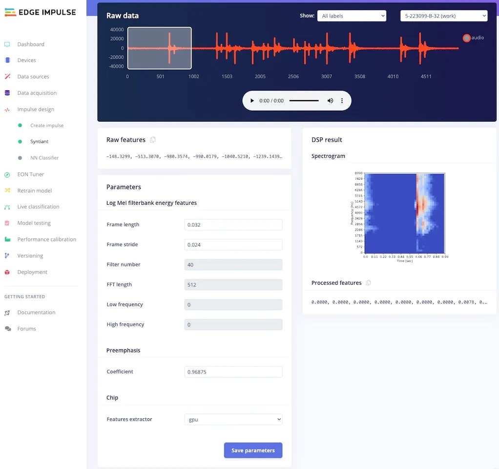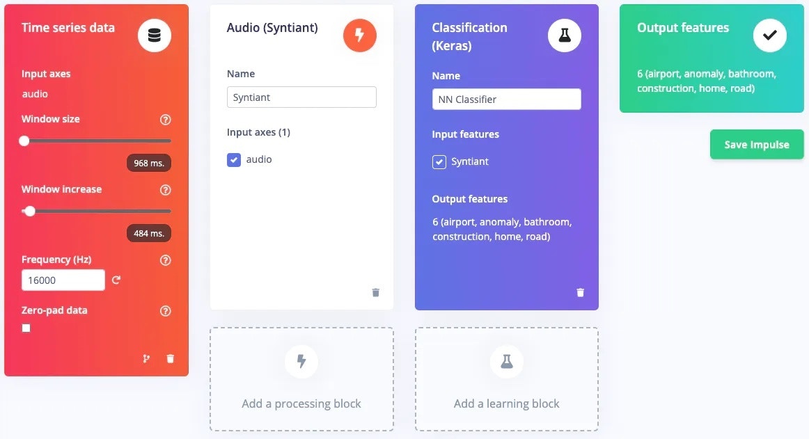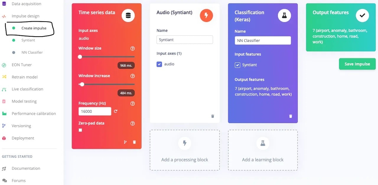 The first thing to do for training an ML model is Impulse design. It can also be thought of as a pipeline design from preprocessing to training.