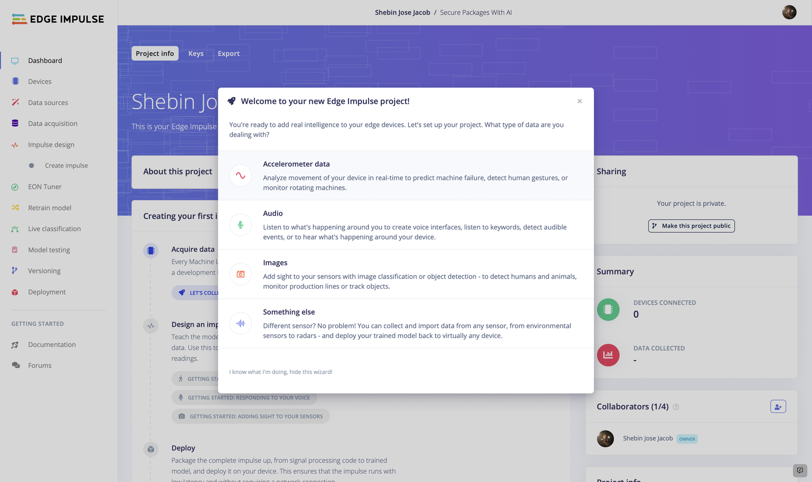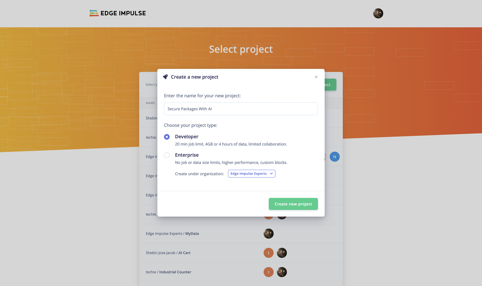 The first step is to create a new Edge Impulse project. If you already have an account, you can create a new project by following the steps shown below. If you don’t have an Edge Impulse account, sign up for a new account and follow the steps.