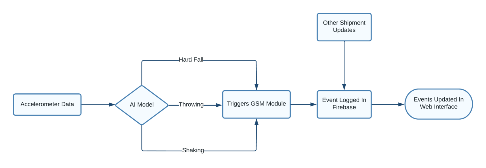 The Arduino Nano 33 BLE Sense has a 9-axis IMU (3-axis accelerometer + 3-axis gyroscope + 3-axis magnetometer), which makes it ideal for recognizing gestures. The movements are classified by an AI model into five classes - Hard Fall, Vigorous Shaking, Throwing, Normal Carrying, and Idle - after ingesting the data from the IMU. Hard Fall, Vigorous Shaking, and Throwing are categorized as “insecure handling” and the rest are categorized as “secure handling”. Once an insecure handling event is detected by the AI model, the GSM module is activated and it logs the insecure handling event in Firebase. The events can be tracked by the user or an internal audit team to analyse the performance of carriers.