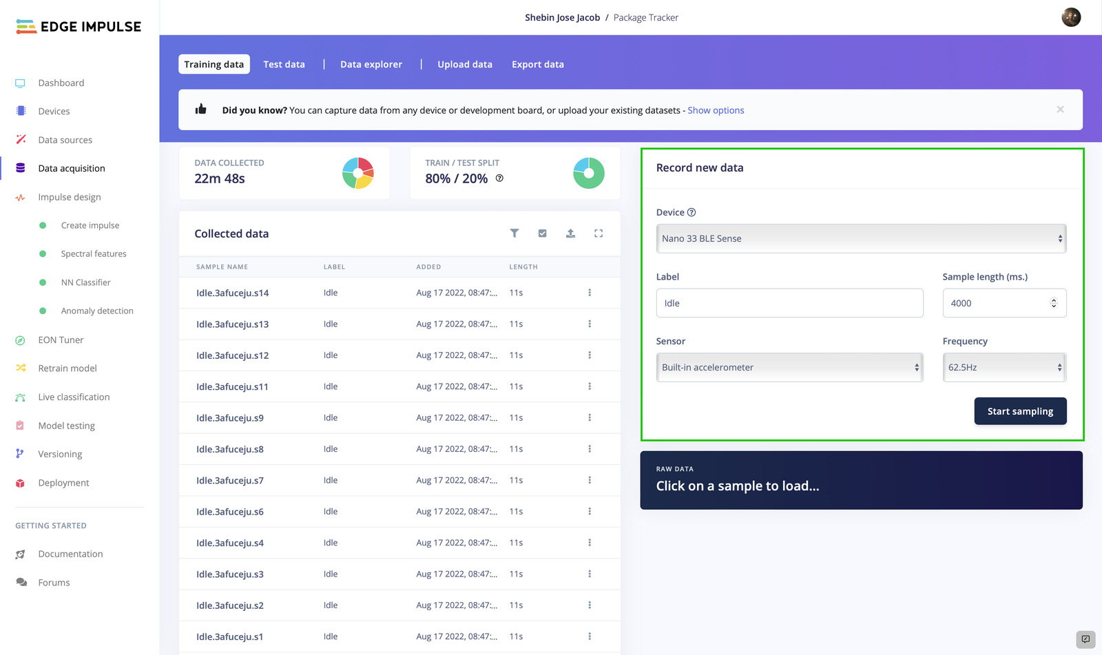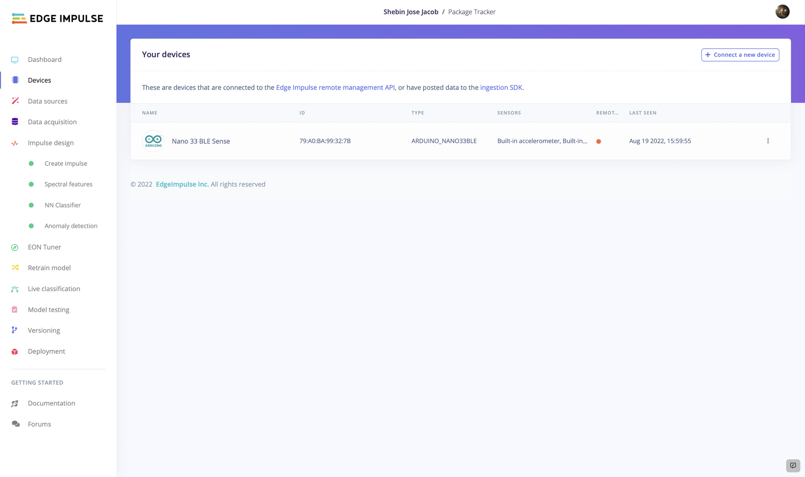 In order to collect accelerometer data directly from the Arduino Nano 33 BLE Sense, we should connect the device to the Edge Impulse Studio first. Follow the steps given here to connect the device with the Studio. After you have completed all the above steps, make sure you see your device in the Devices tab.