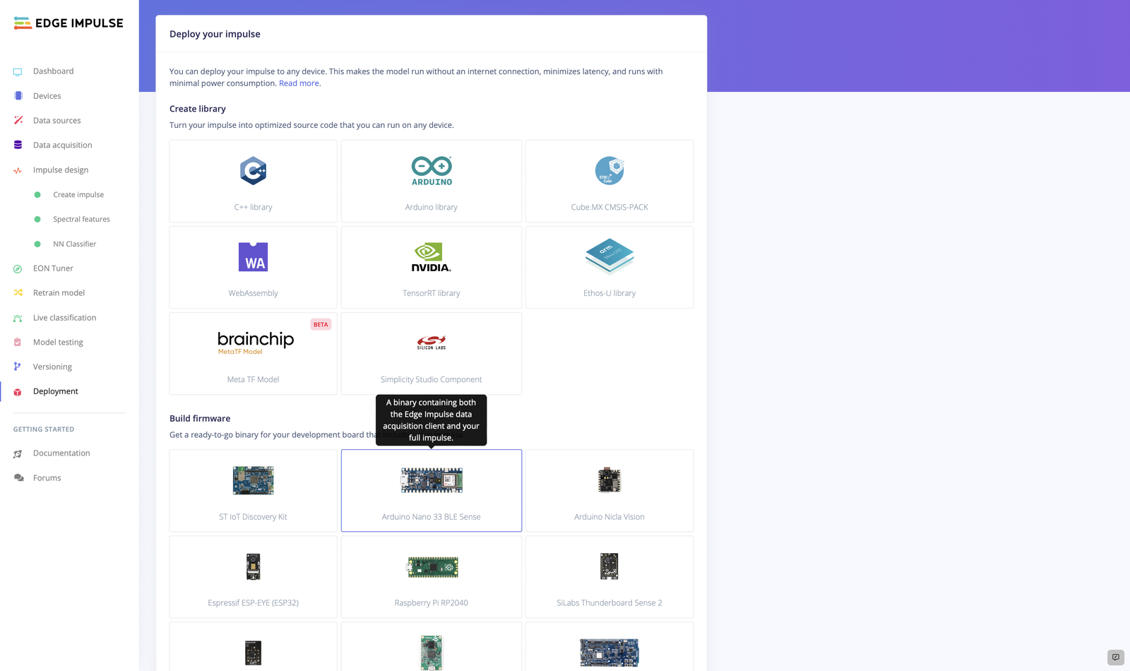 Once the model is trained and tested, it’s time to deploy it back to the device. For this, navigate to Deployment > Build Firmware. Select Arduino Nano 33 BLE Sense and Build. It will generate the model and download it to your computer as a Zip file. Add the downloaded Zip file in the Arduino libraries, and you are good to go.
